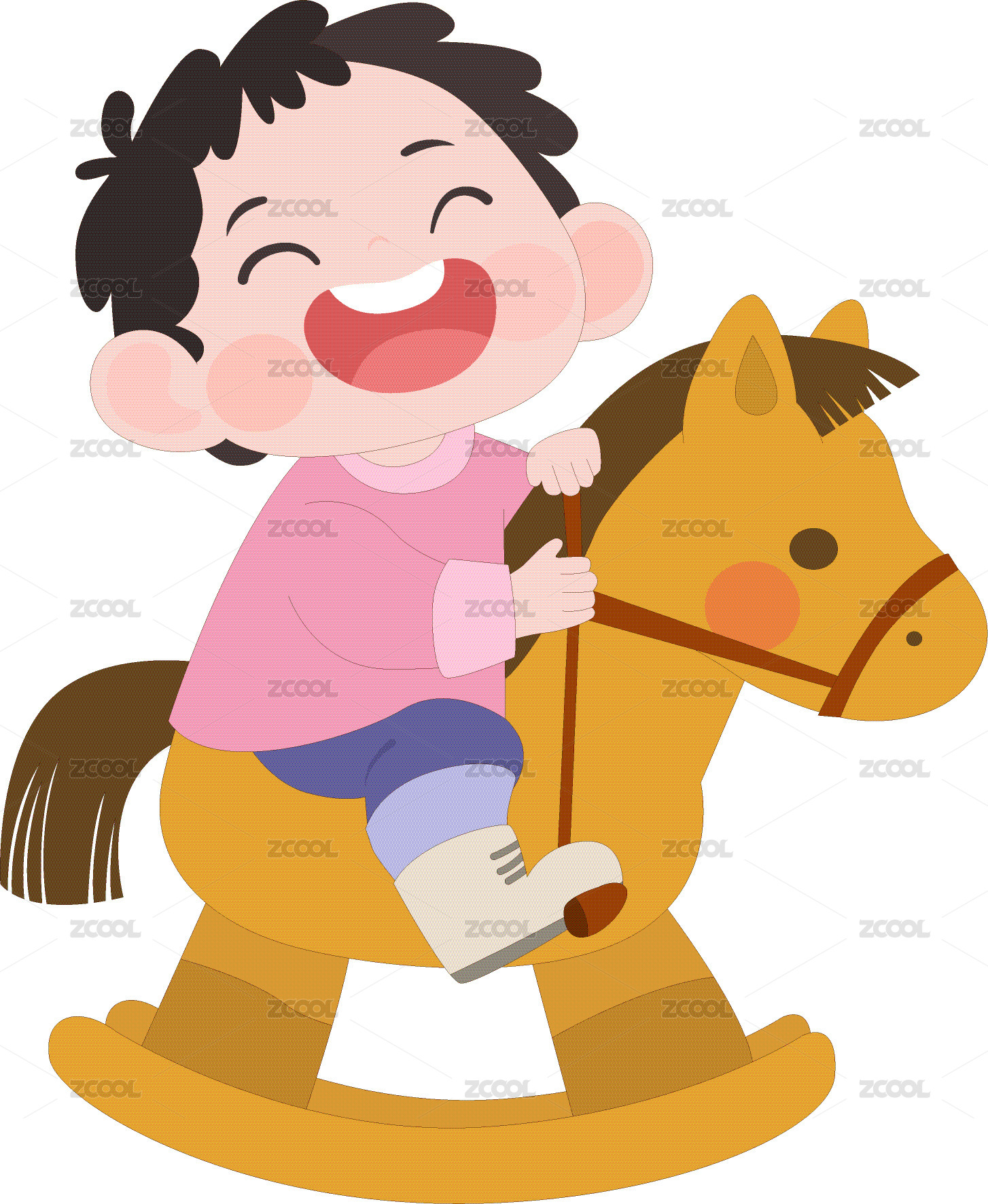 卡通男孩騎木馬玩具開心大笑小朋友兒童插畫