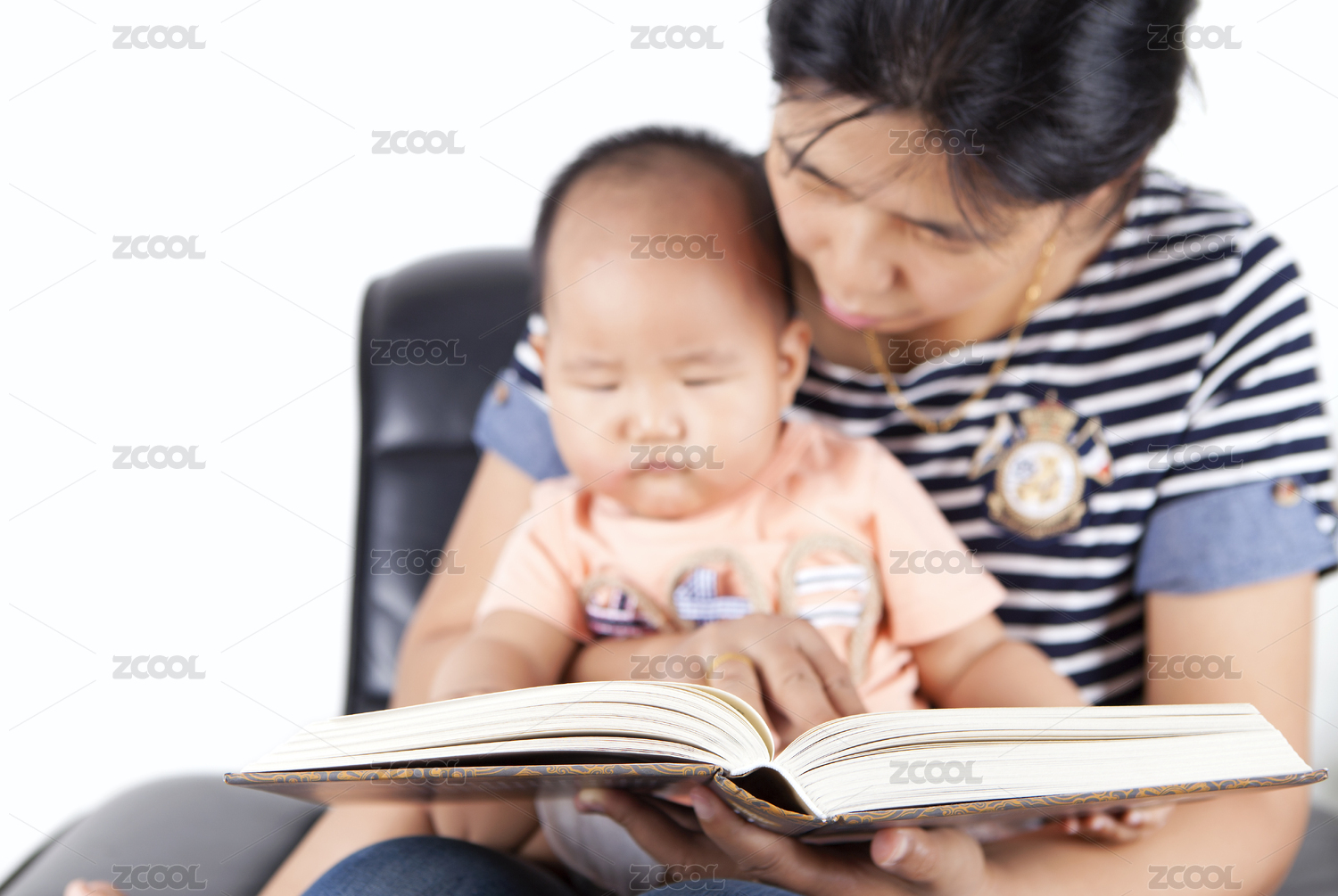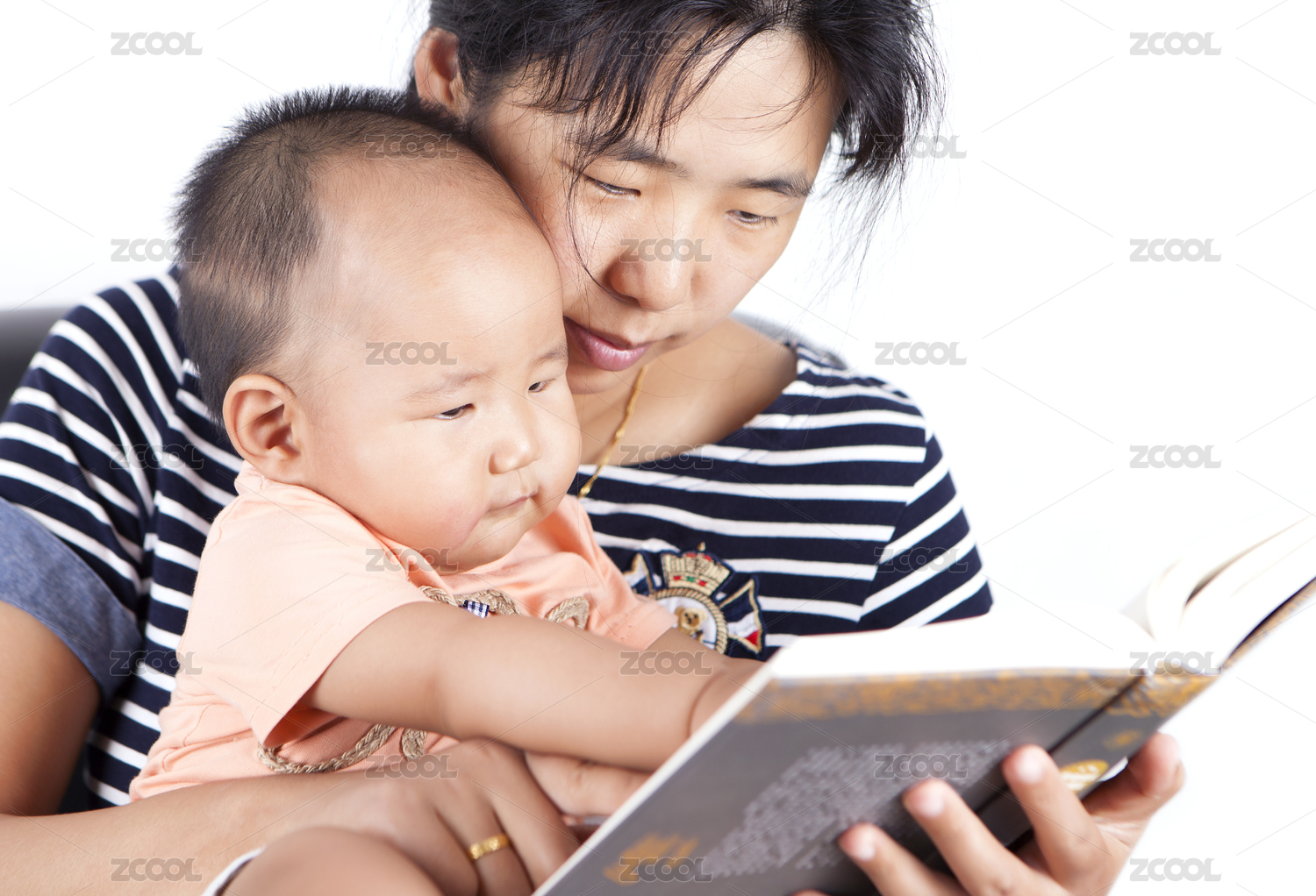 學著看書的孩子和年輕媽媽