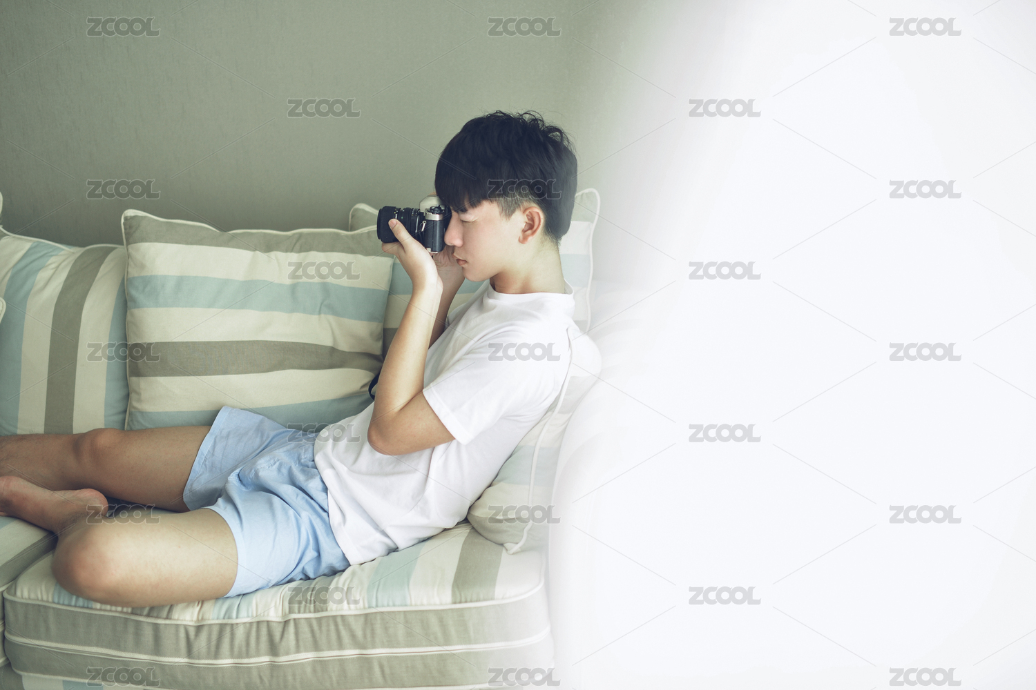 室內(nèi)居家沙發(fā)坐著低頭玩相機(jī)白衣服男生