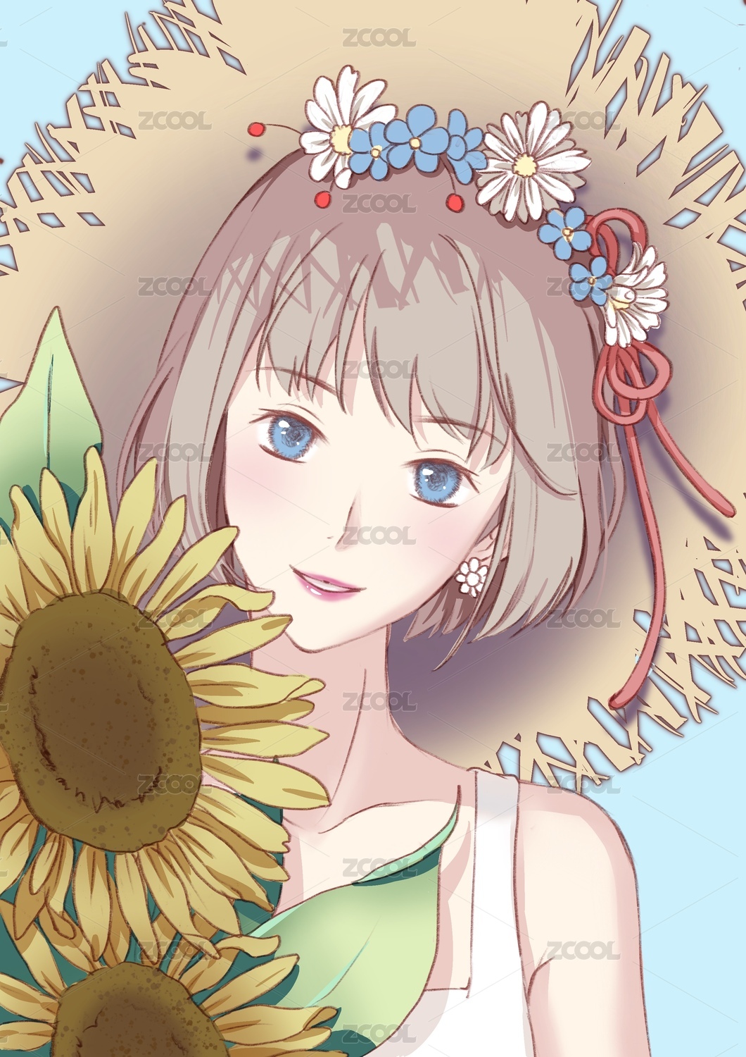 手捧向日葵花束的草帽短發(fā)少女