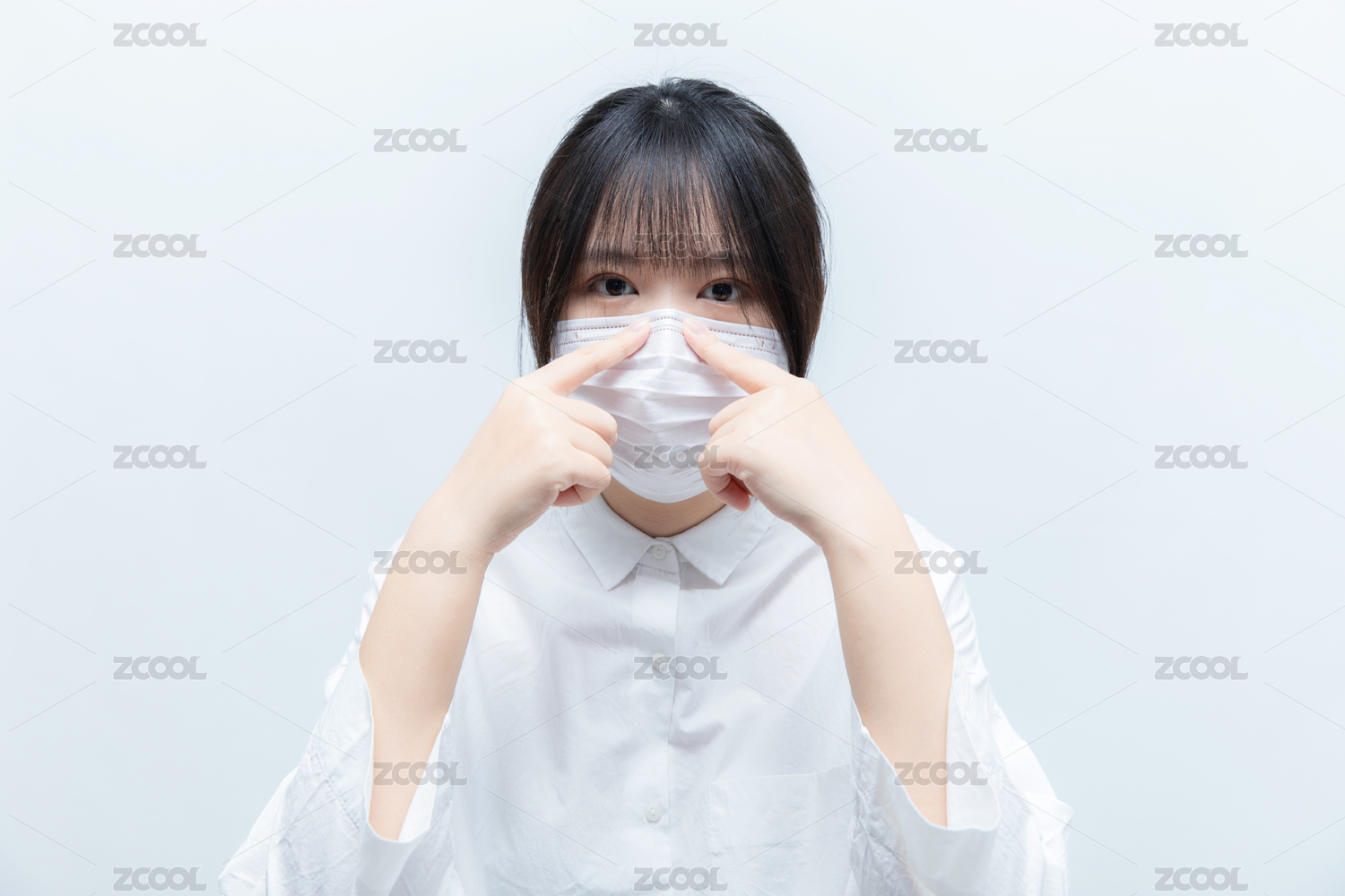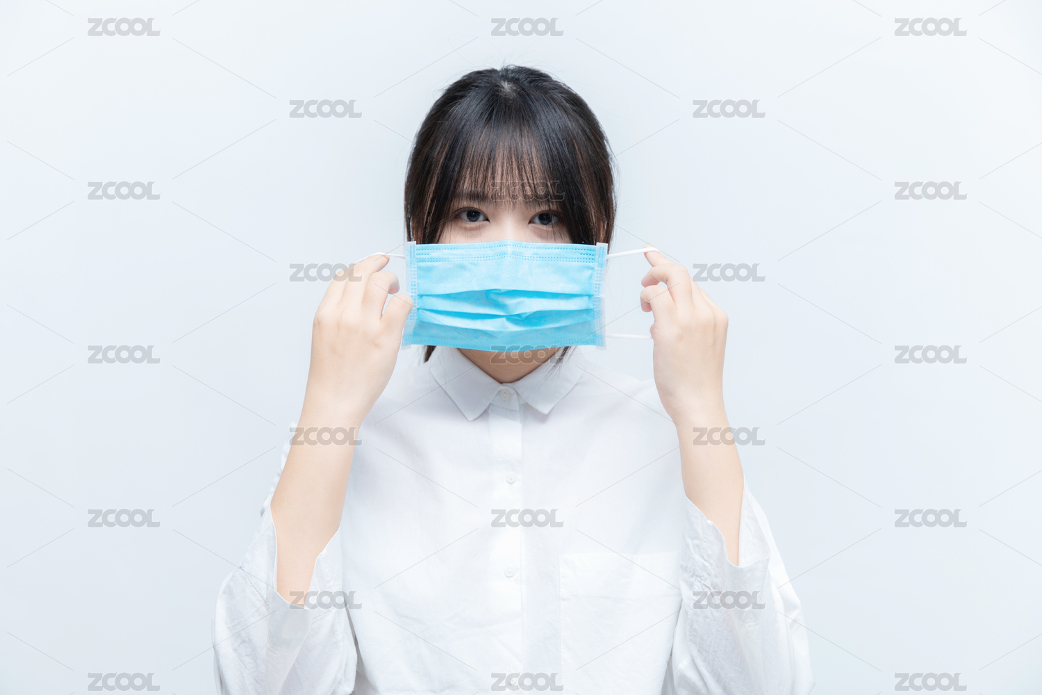 穿白衣服的亞洲東方女生正在戴一次性醫(yī)口罩
