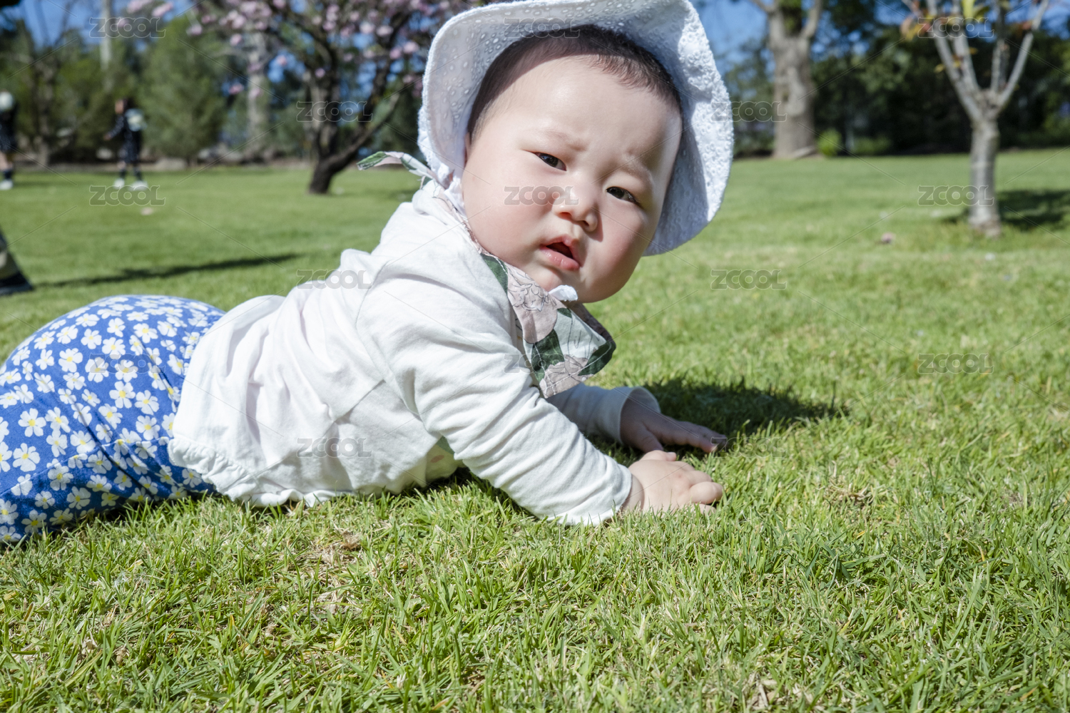 綠色的草地上帶帽子的中國女嬰幼兒