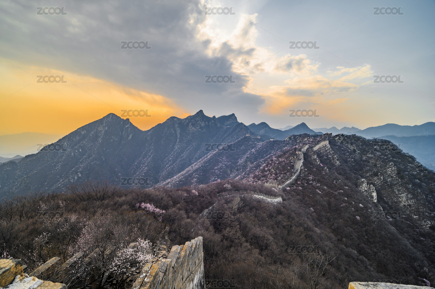 春天早晨北京明長(zhǎng)城箭扣長(zhǎng)城與山杏花