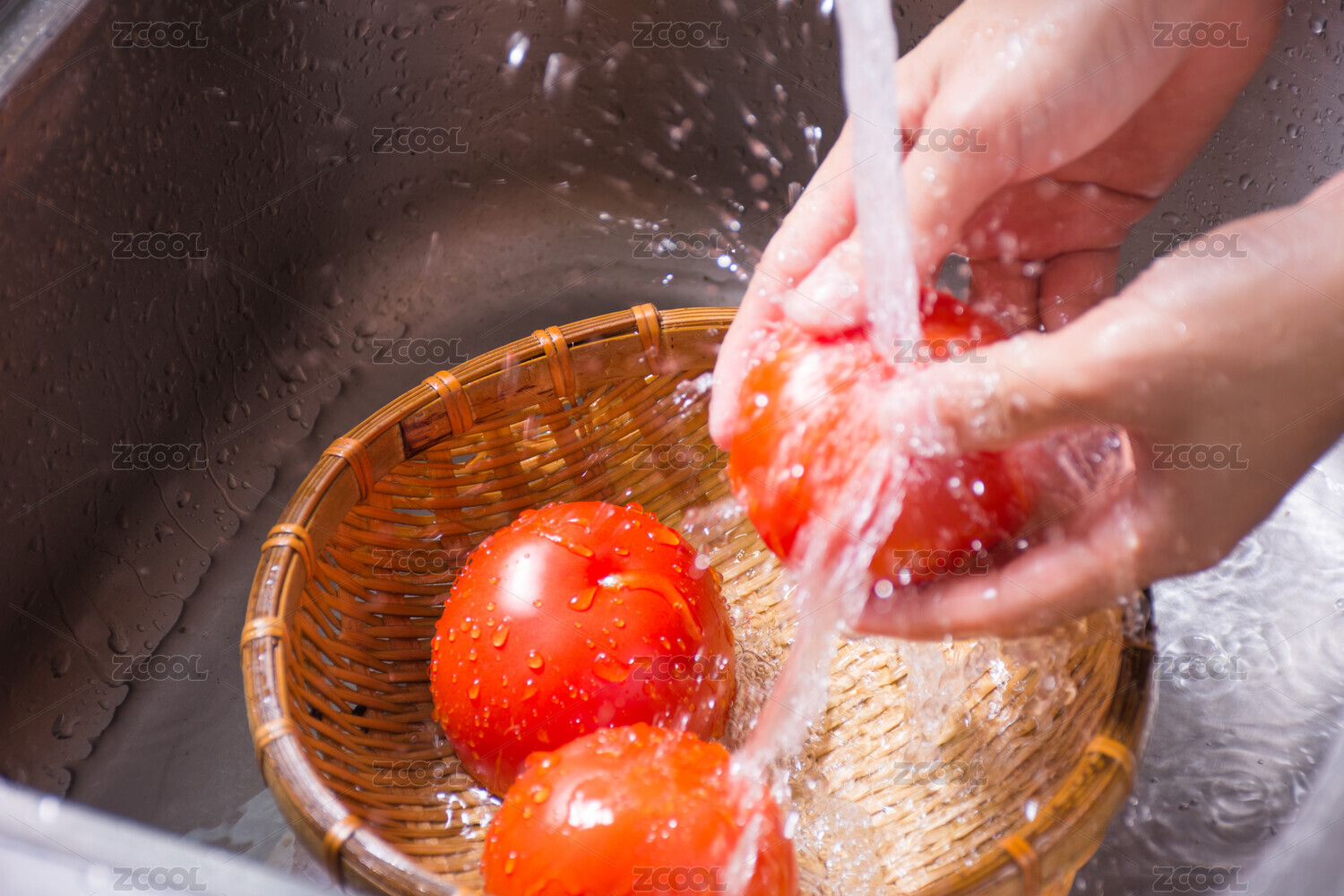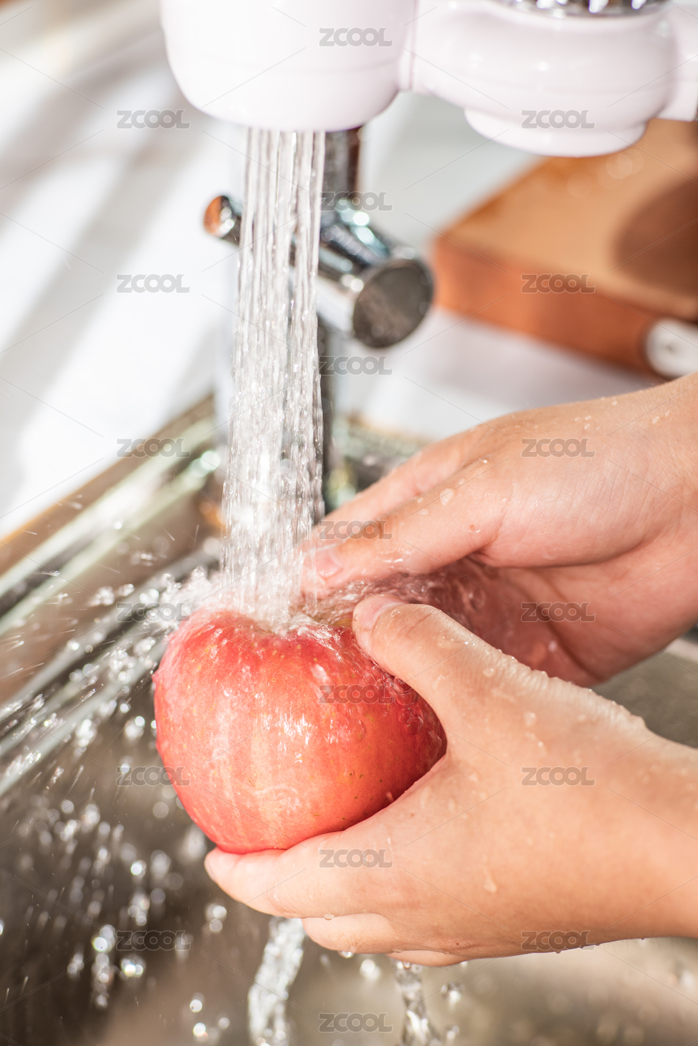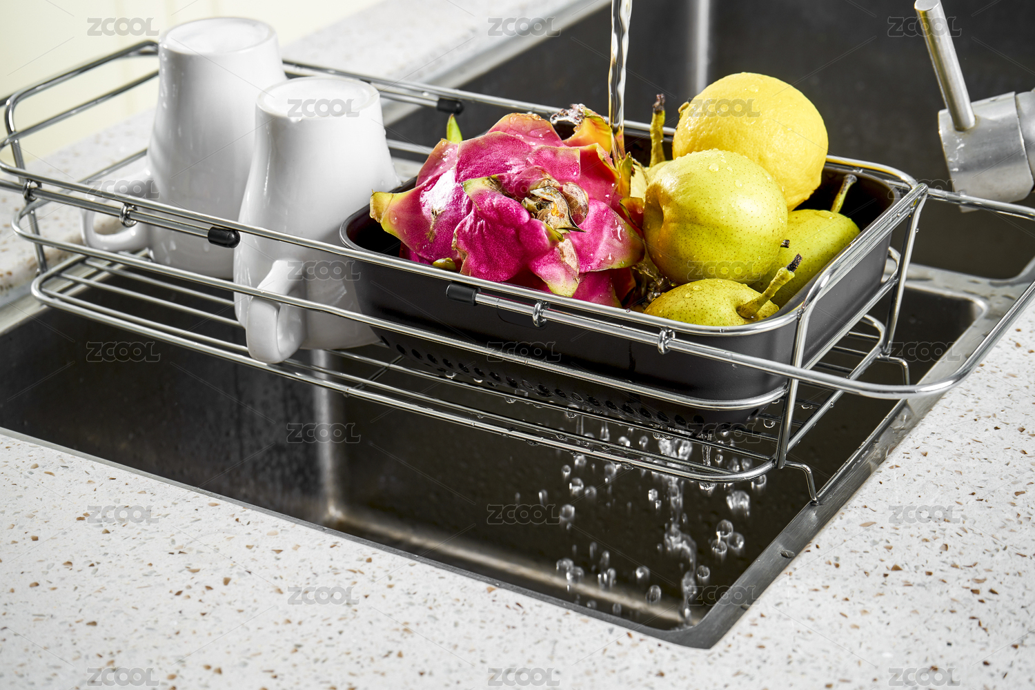 放在廚房洗水槽上的水果正在用自來水沖洗