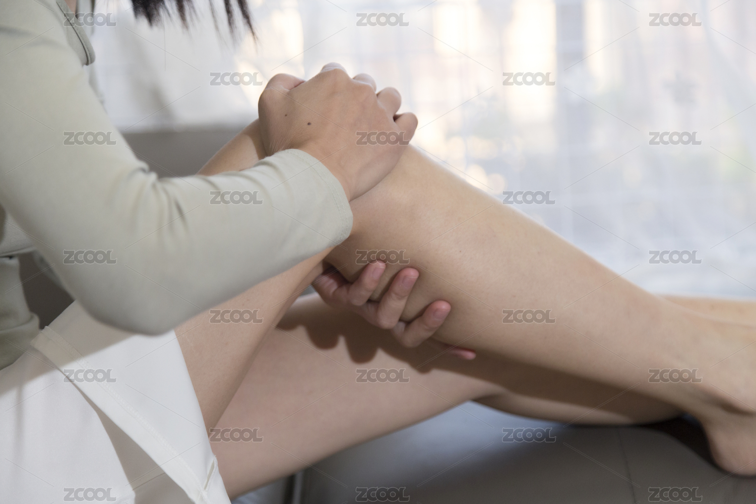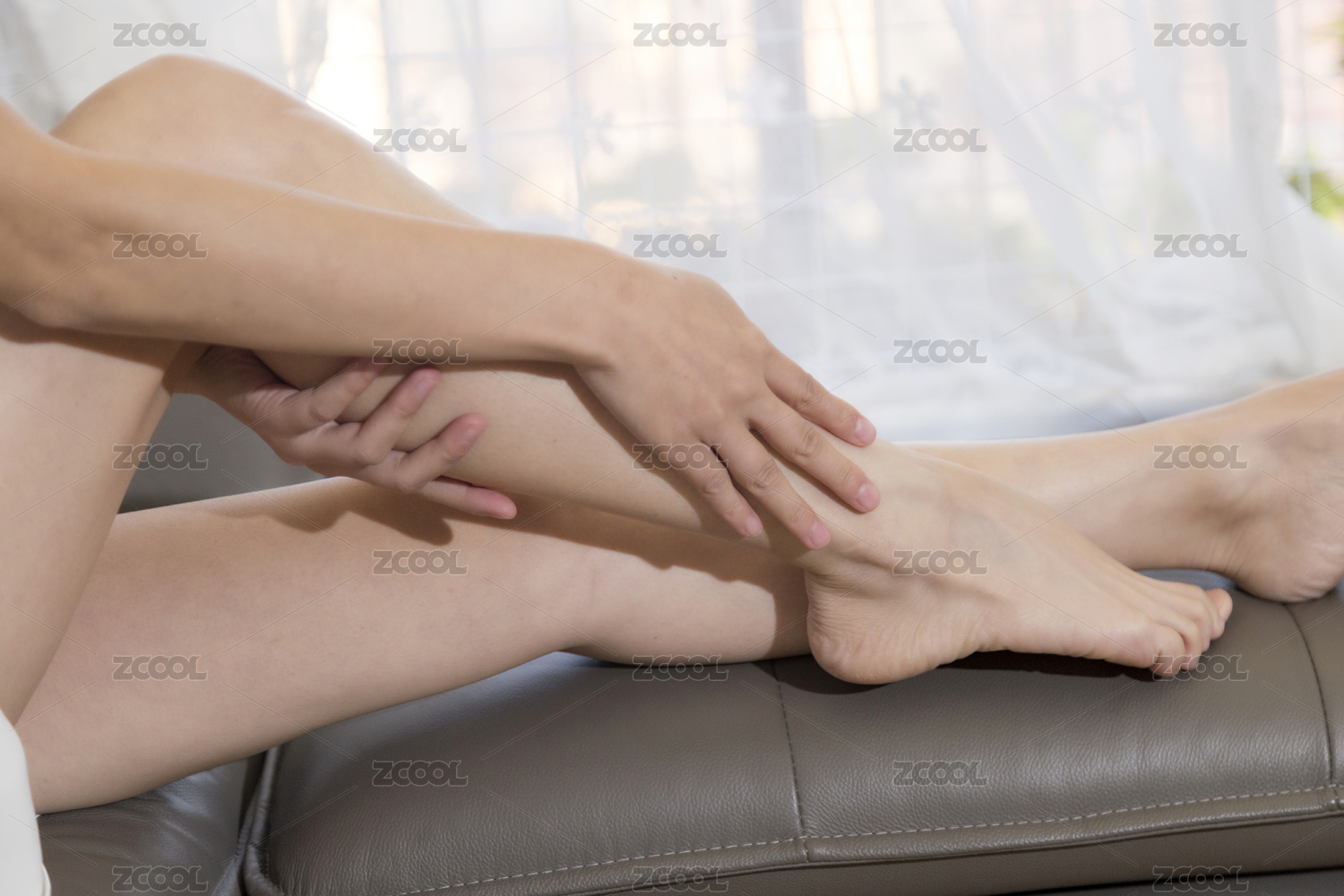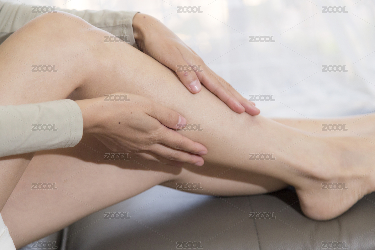 女人在沙發(fā)上用雙手按摩小腿