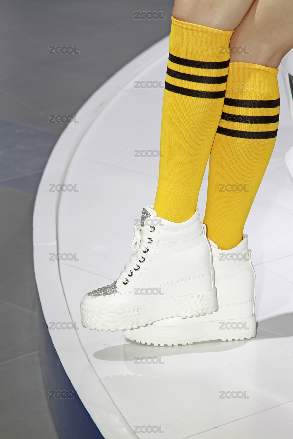 白色厚底鞋搭配黃色條紋襪