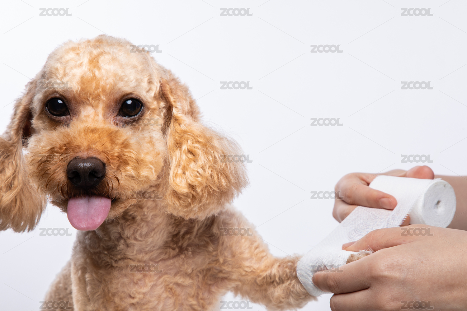 特寫女醫(yī)生手在幫貴賓狗包扎受傷的小腿