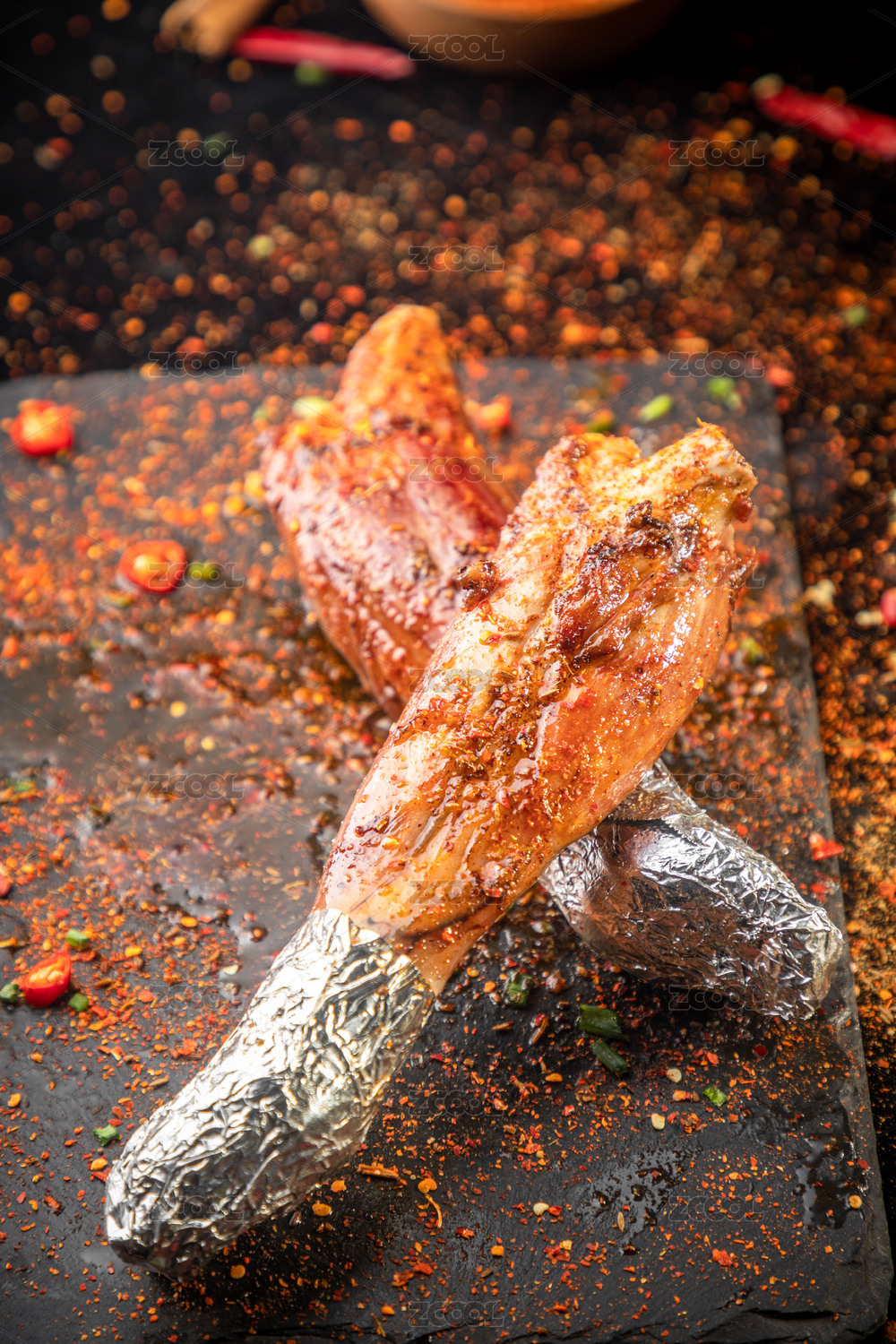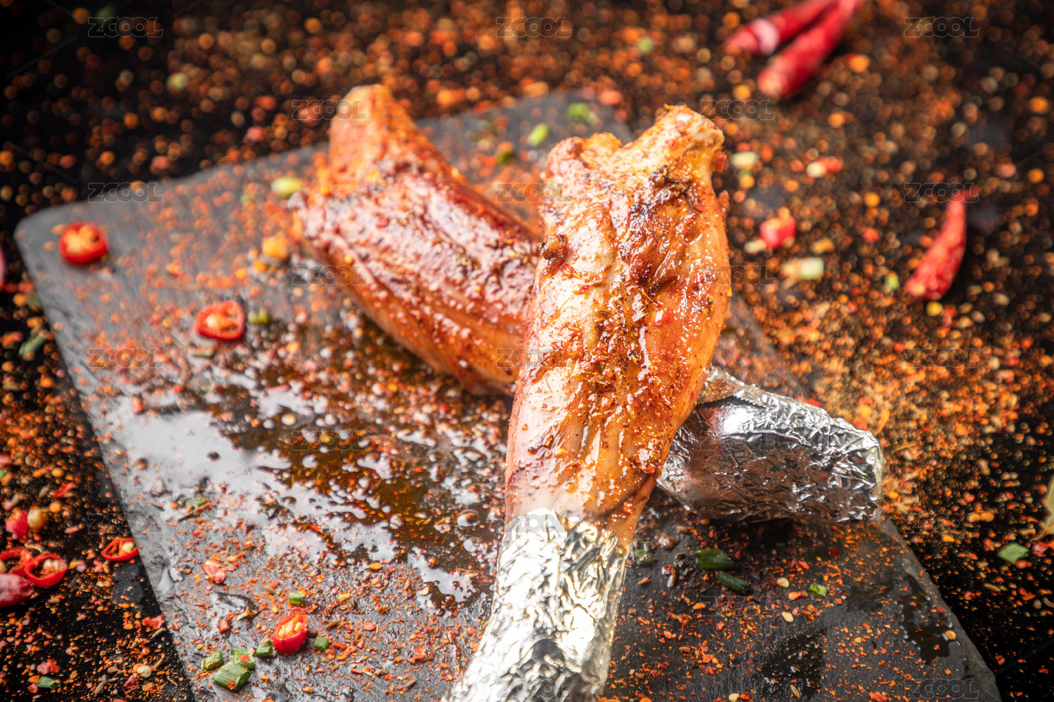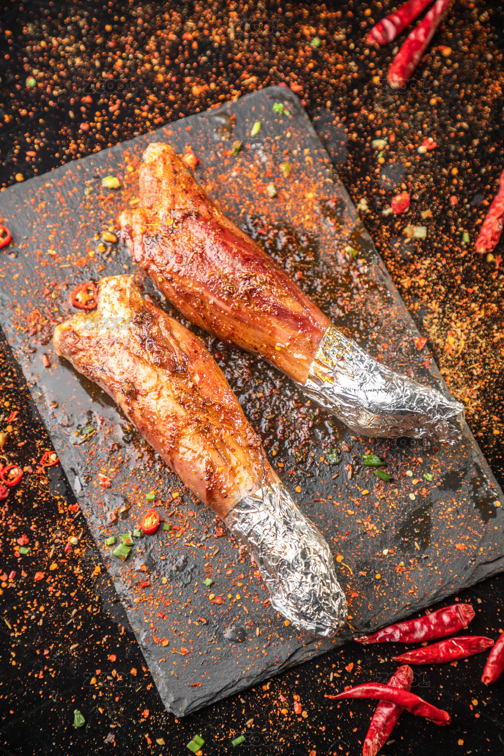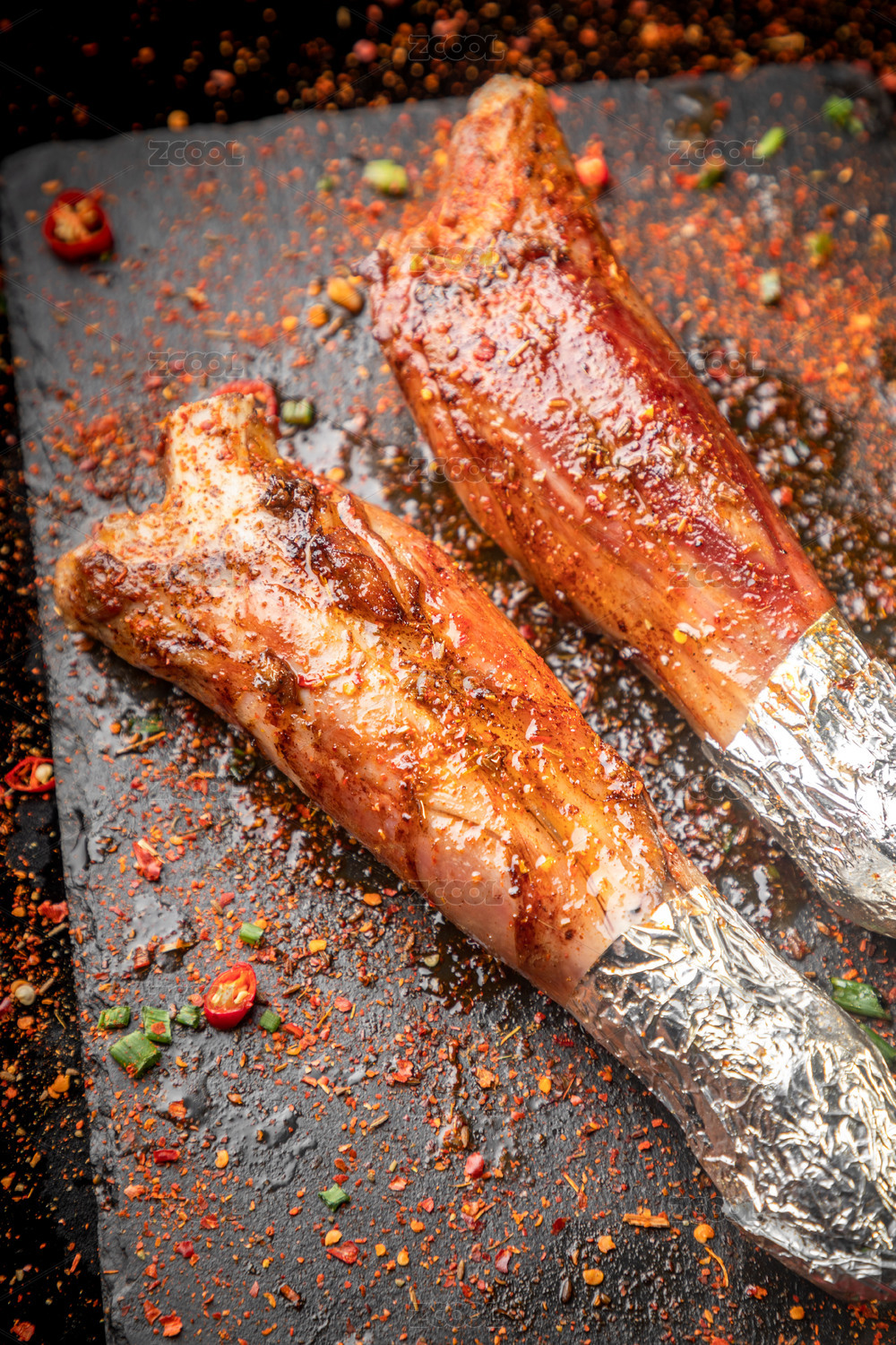 黑石板上放著一對烤羊前腿