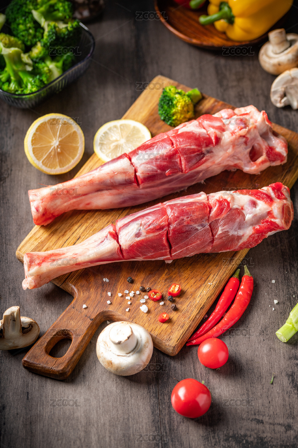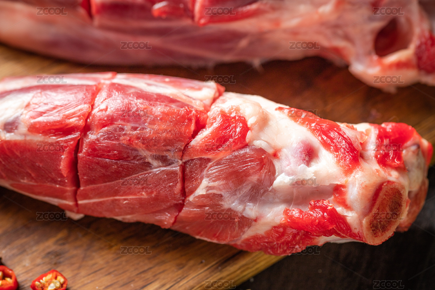 棕色木紋桌上有一兩只羊小腿
