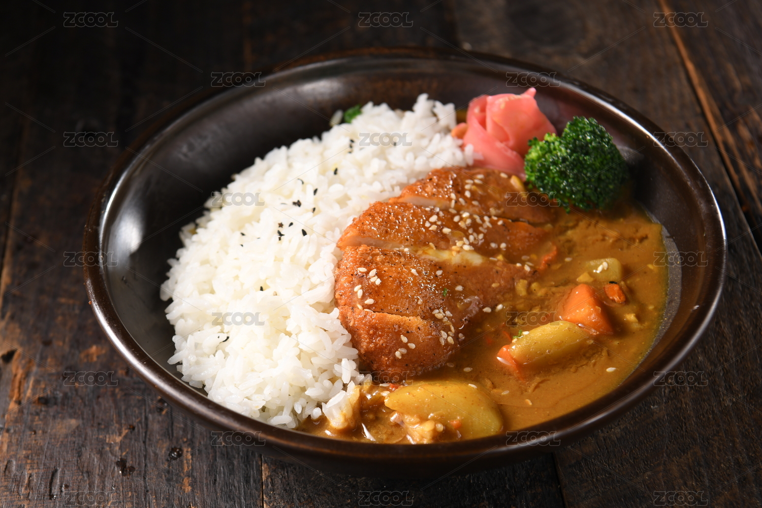單色背景下的咖喱豬排飯