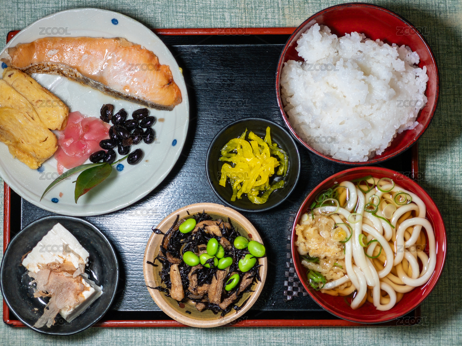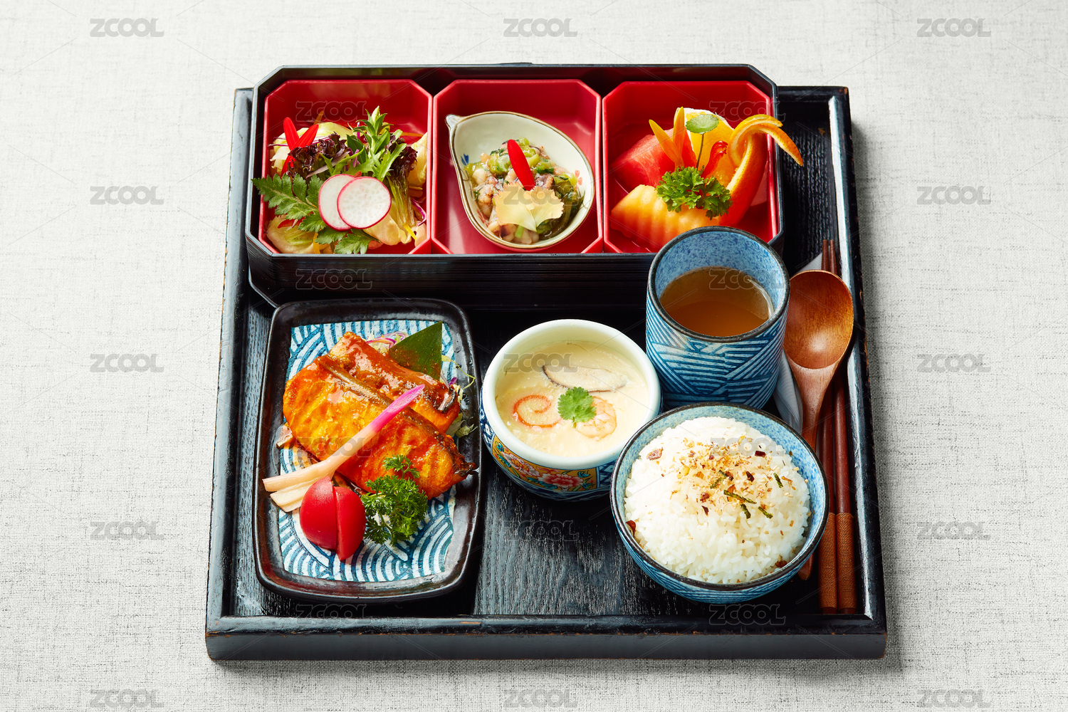 包含各種菜肴的傳統(tǒng)日式三文魚定食