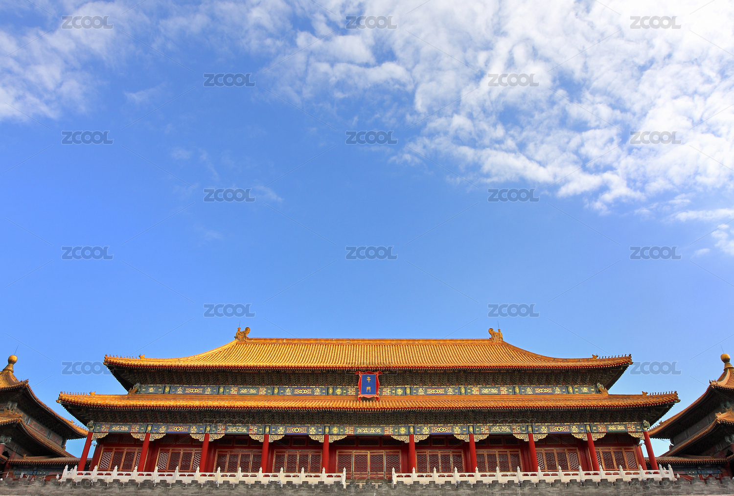 藍(lán)天白云下雄偉的北京故宮紫禁城午門(mén)。