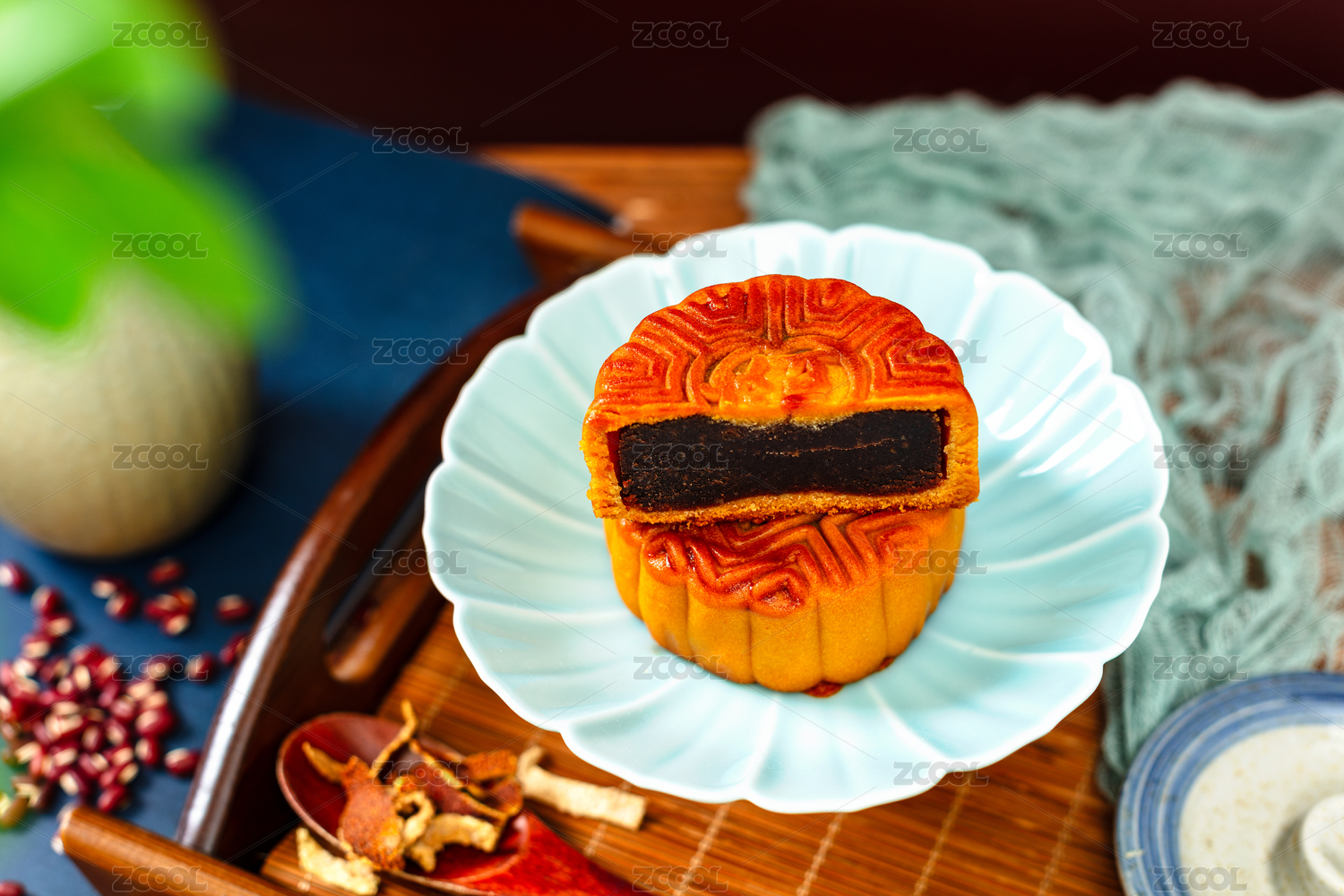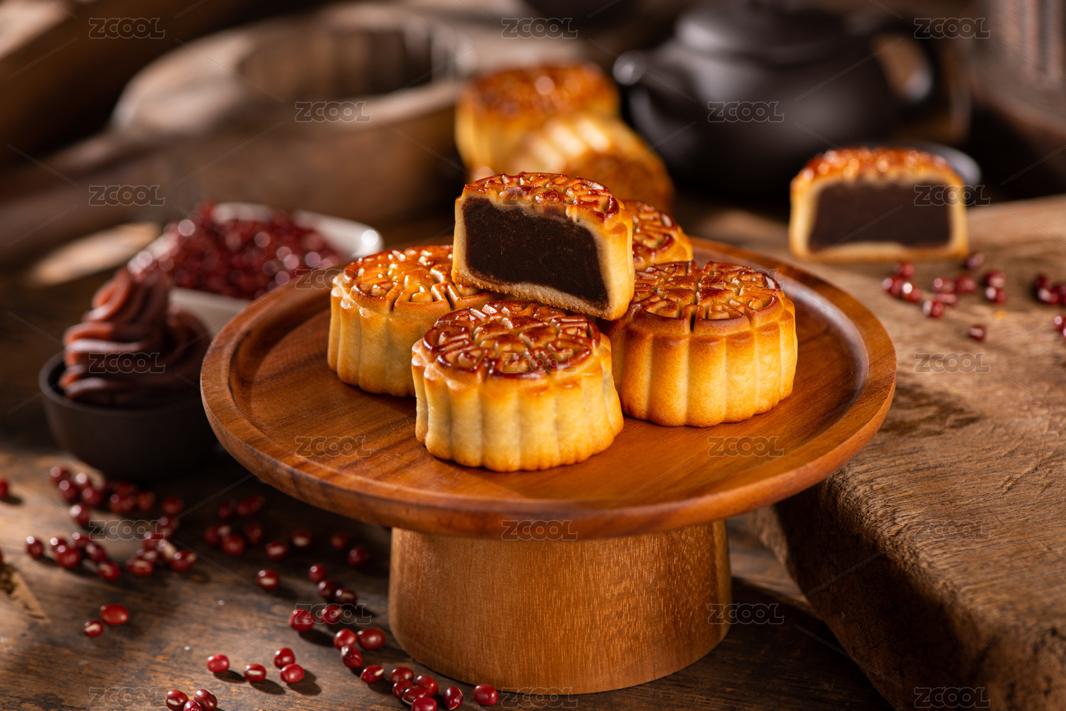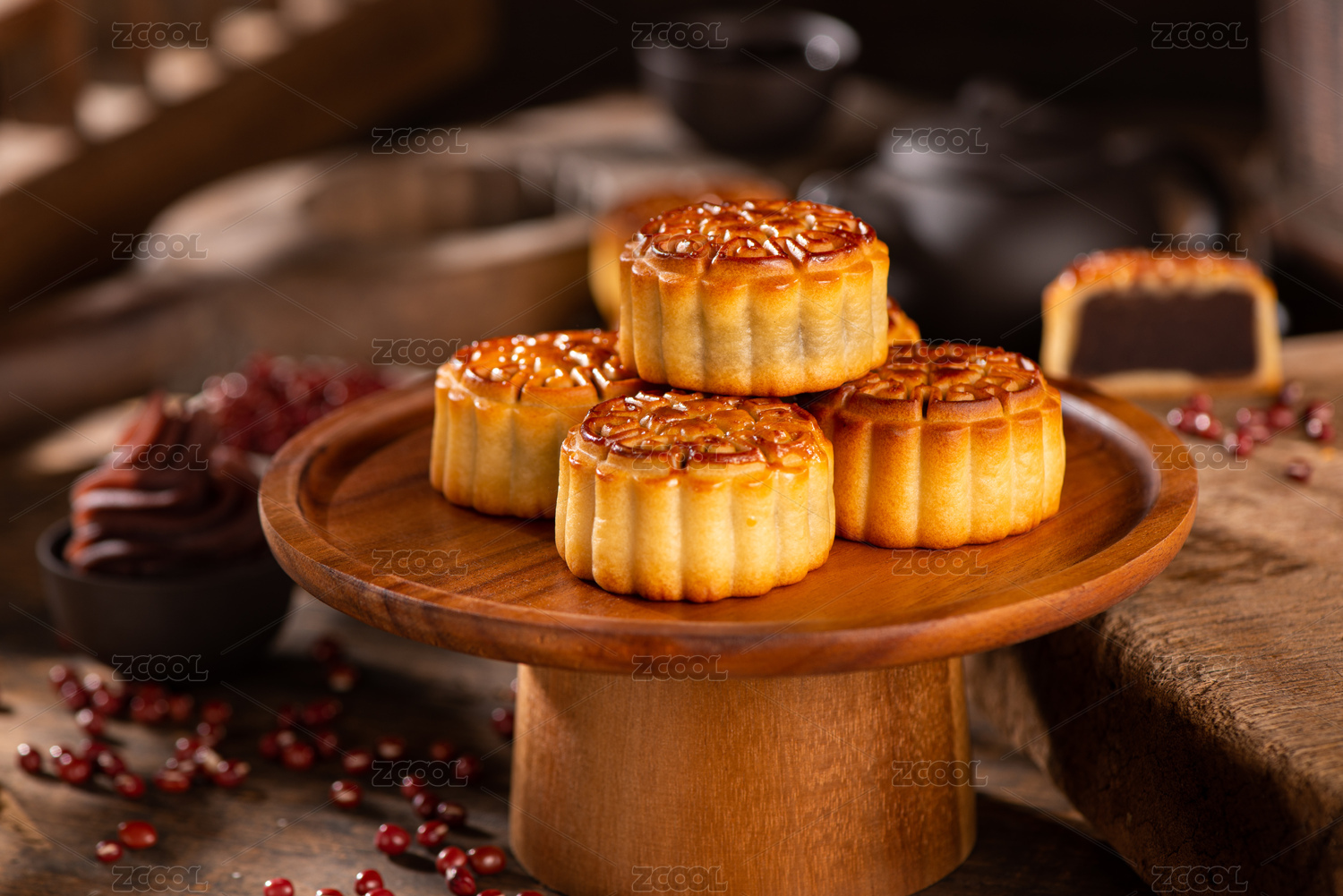 木質(zhì)桌面上米色餐巾旁黃色蛋黃酥漏出紅色豆沙餡