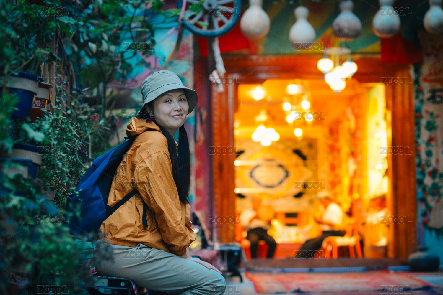亞洲女性在中國新疆喀什古城老街看傳統(tǒng)表演