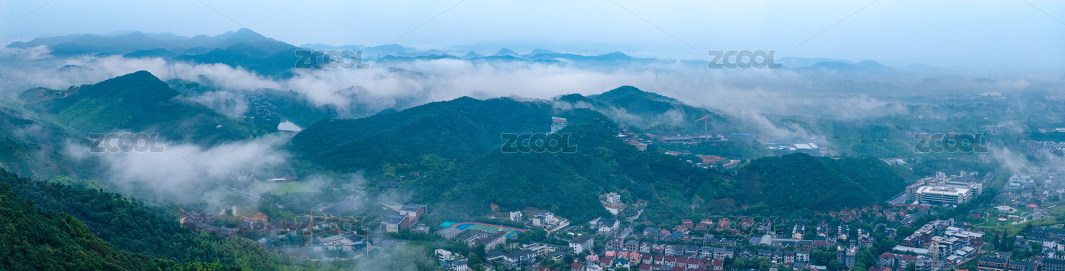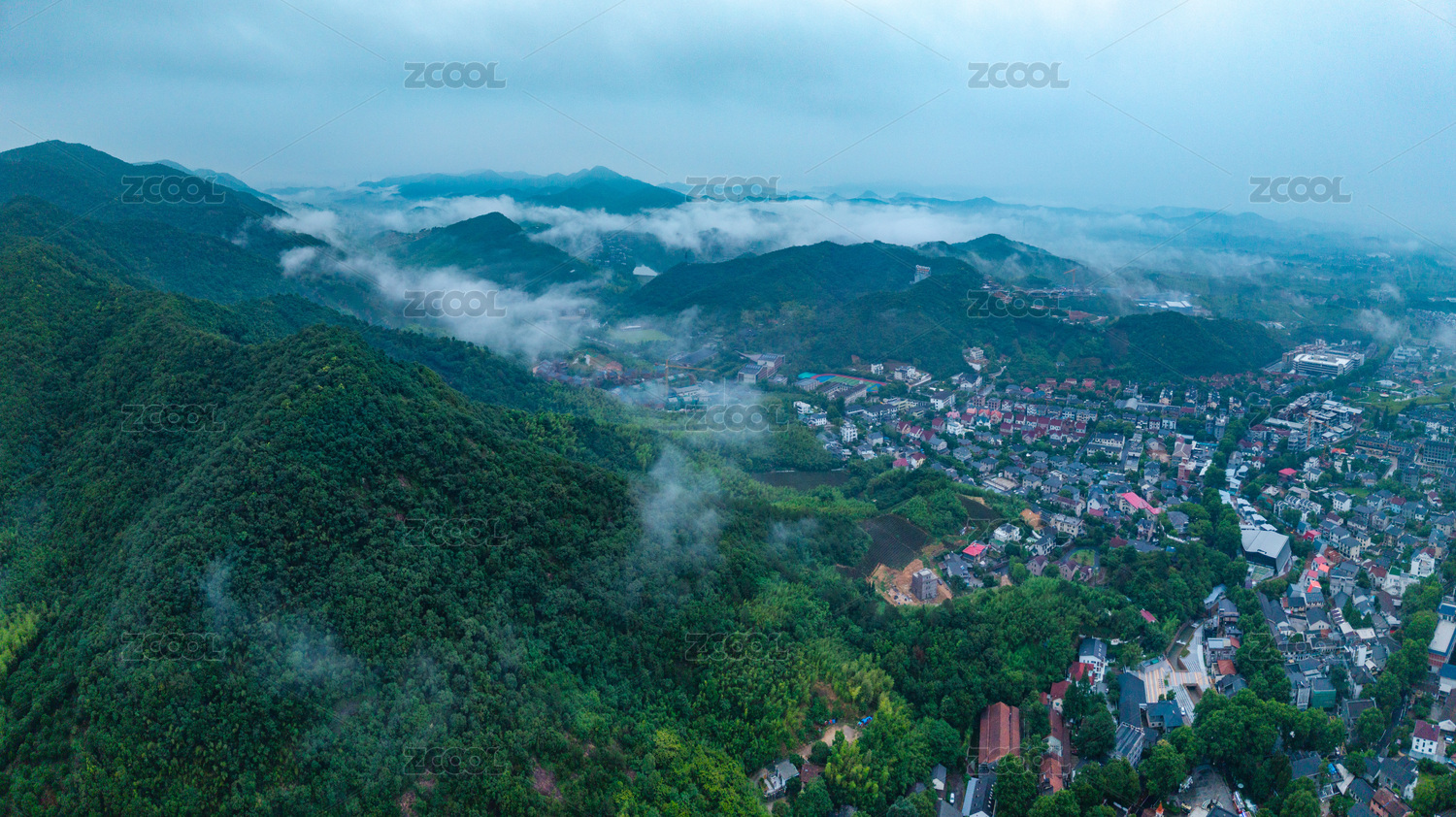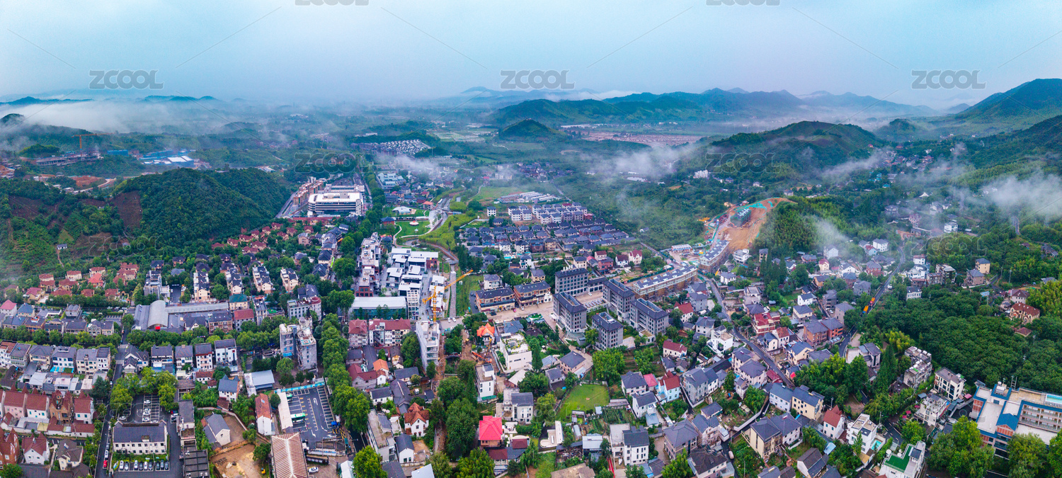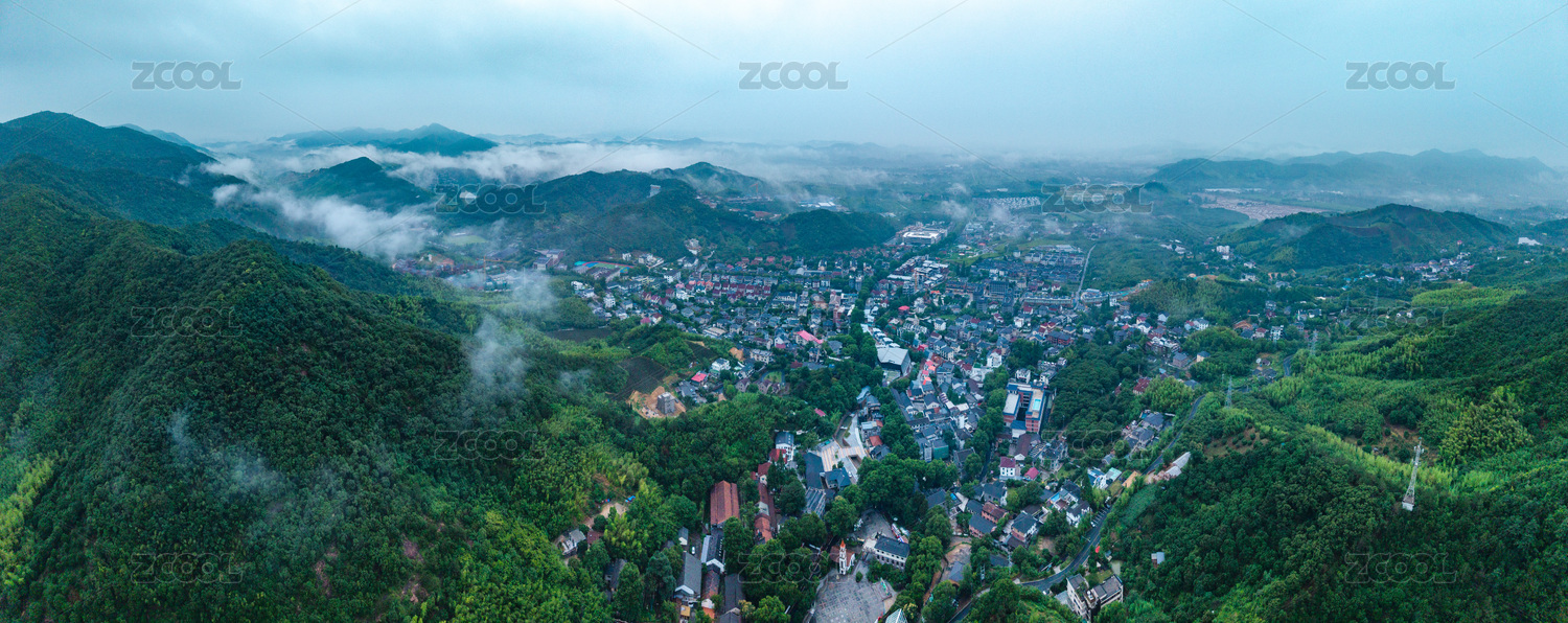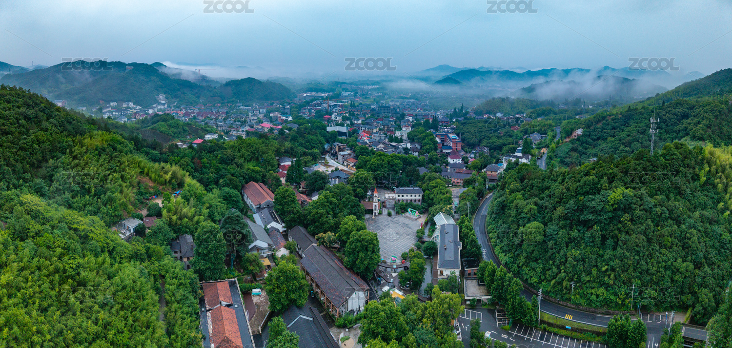 浙江湖州市莫干山云霧繚繞山間村落全景航拍