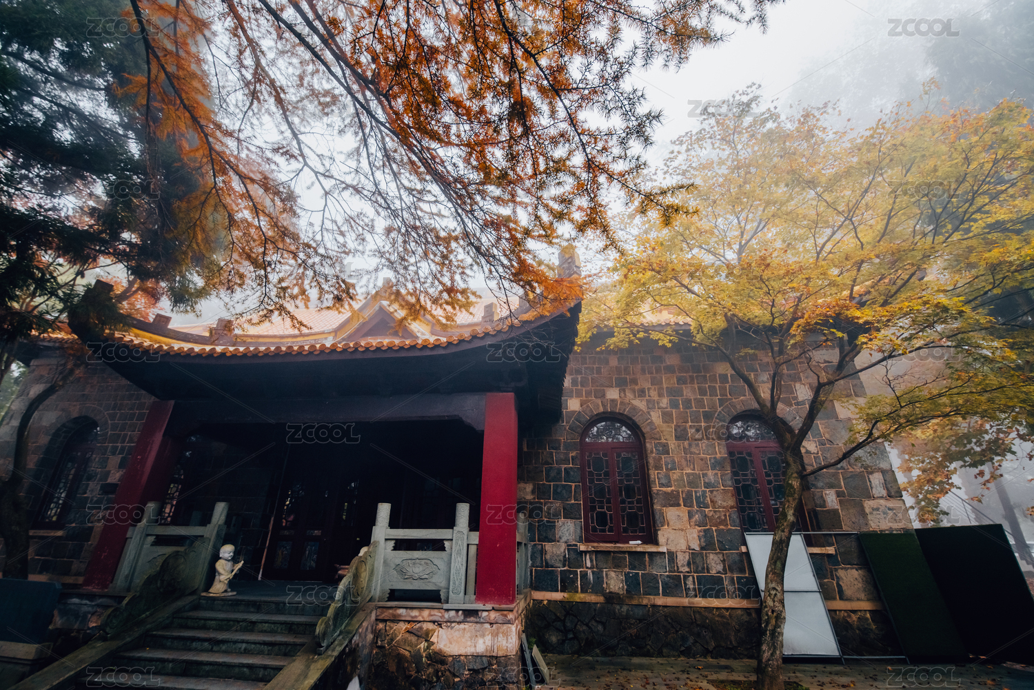 深秋濃霧中色彩絢爛的莫干山