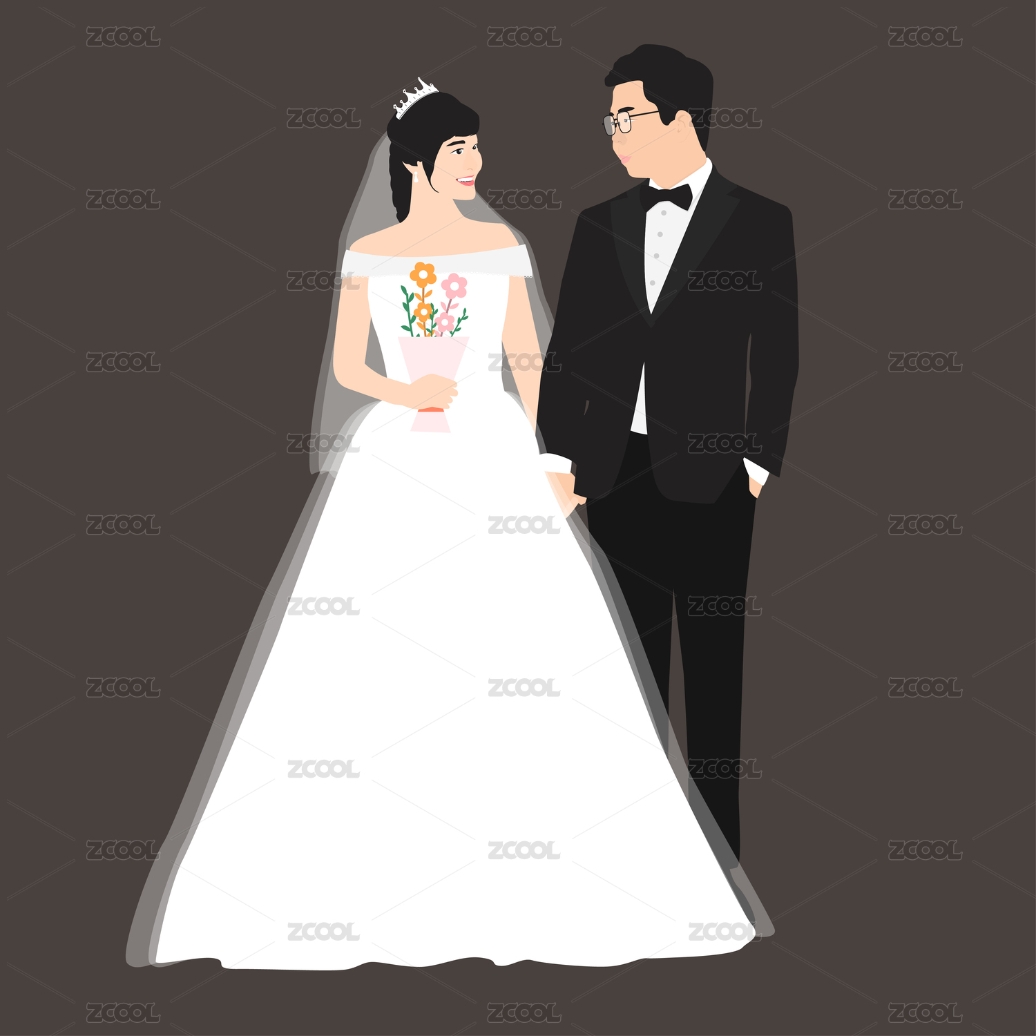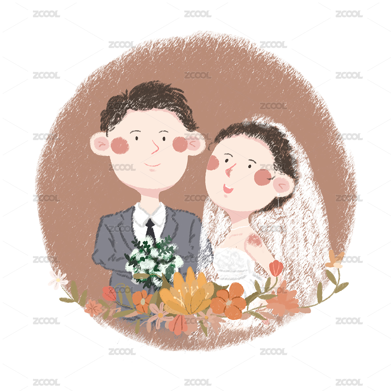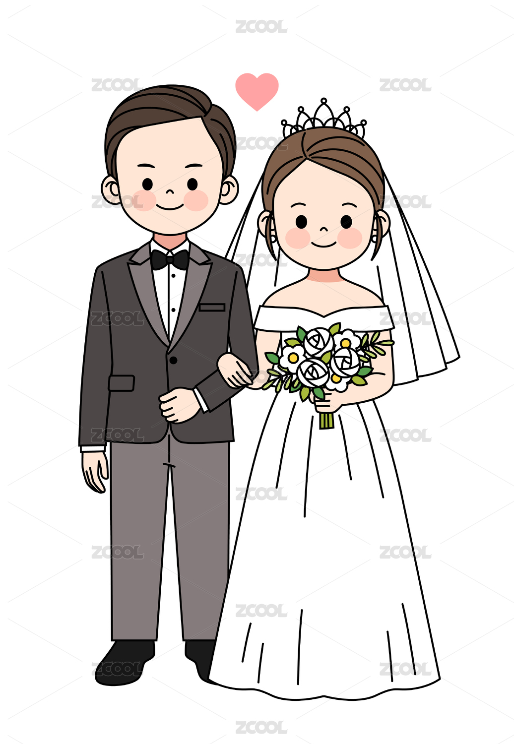 卡通新郎新娘婚紗照插畫