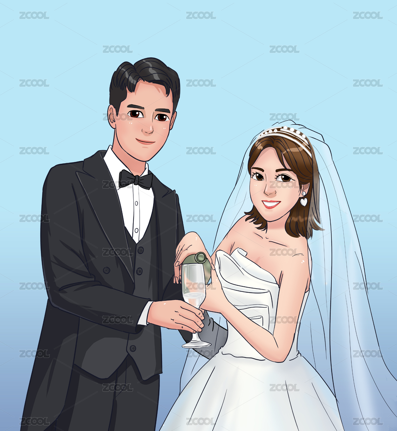 情侶卡通婚紗照插畫