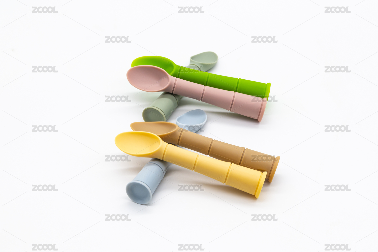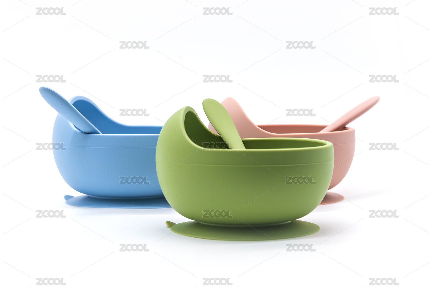 白色背景上的各色嬰幼兒用硅膠餐具碗與勺
