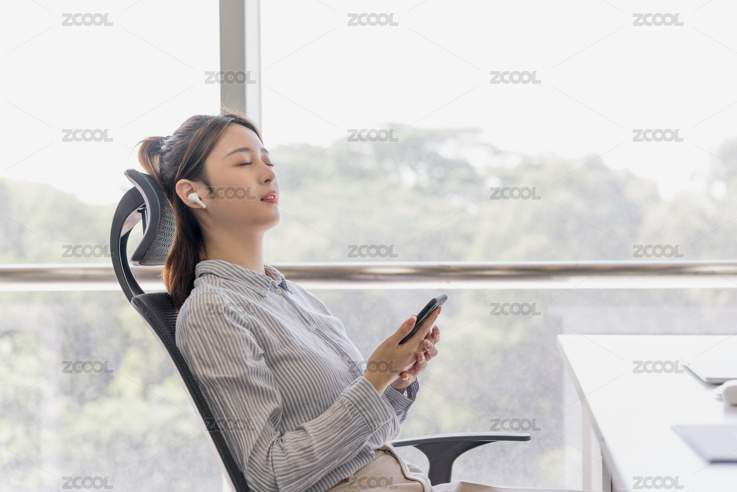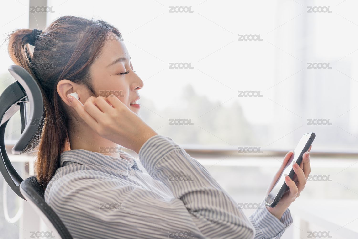 商務女性在辦公室工位上聽音樂