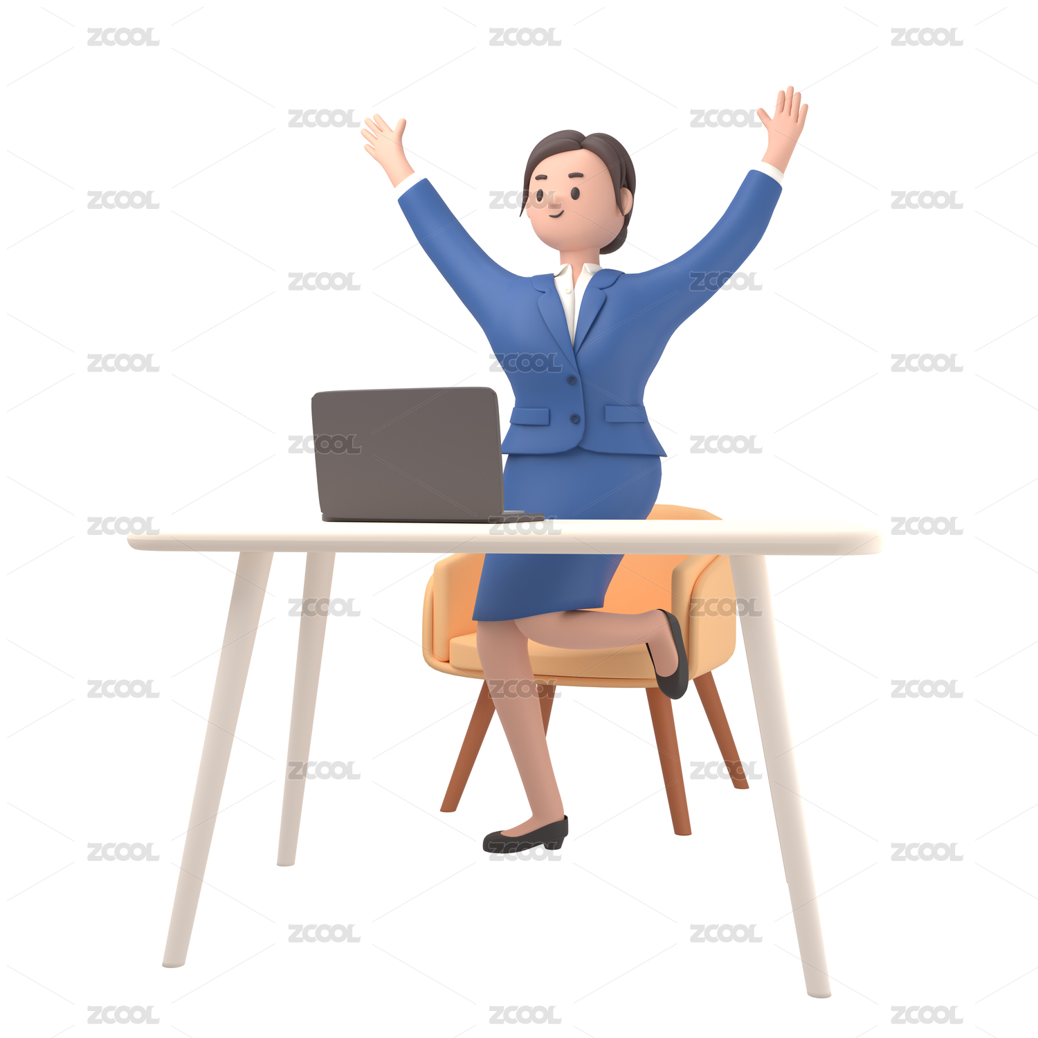 3d渲染在工位歡呼跳躍的女白領插畫