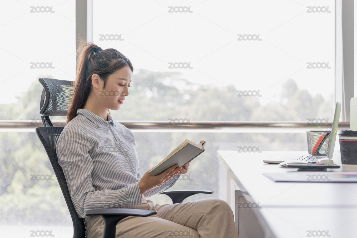 商務女性在辦公室工位上看書閱讀