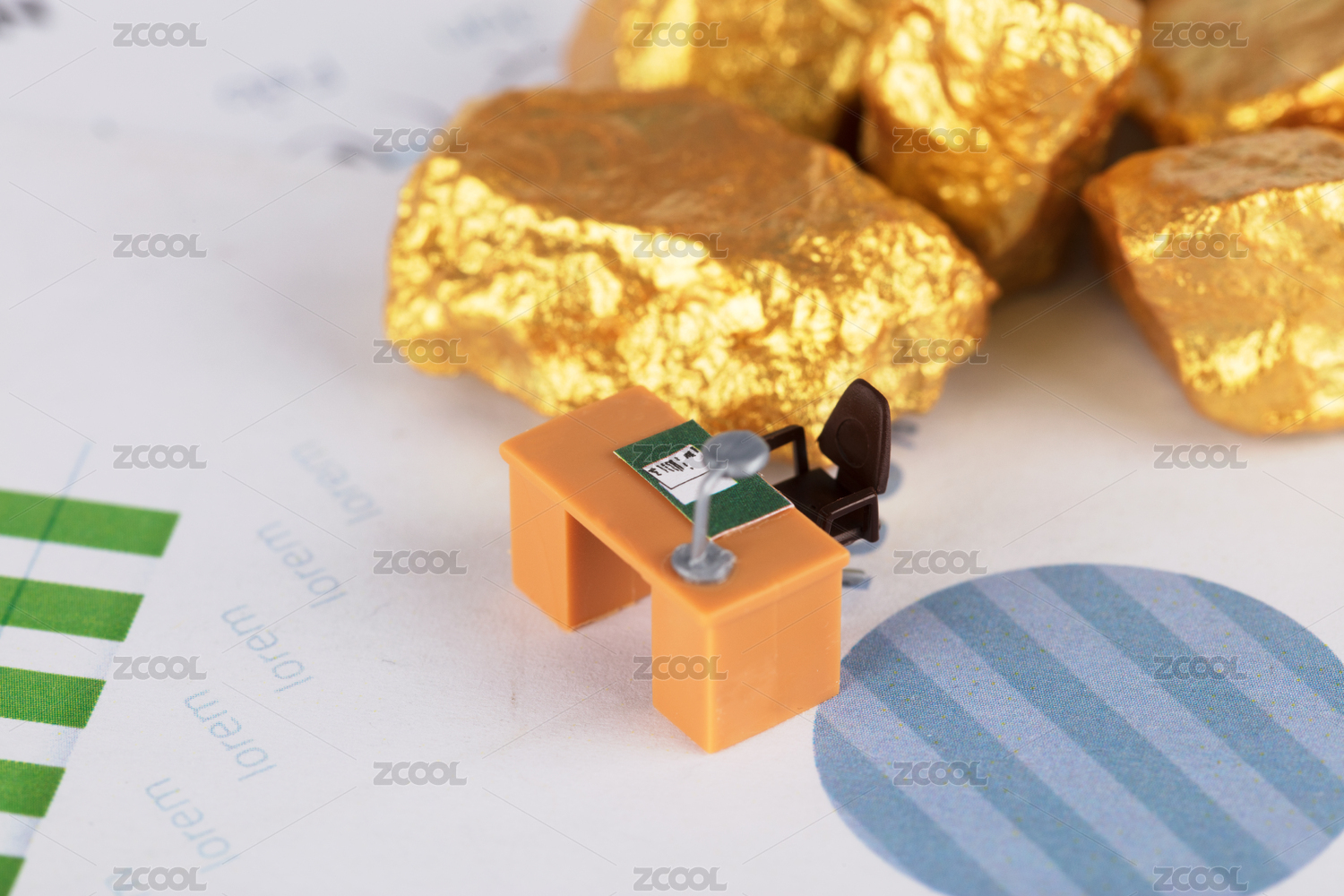 黃金金塊和一個微縮的工作工位