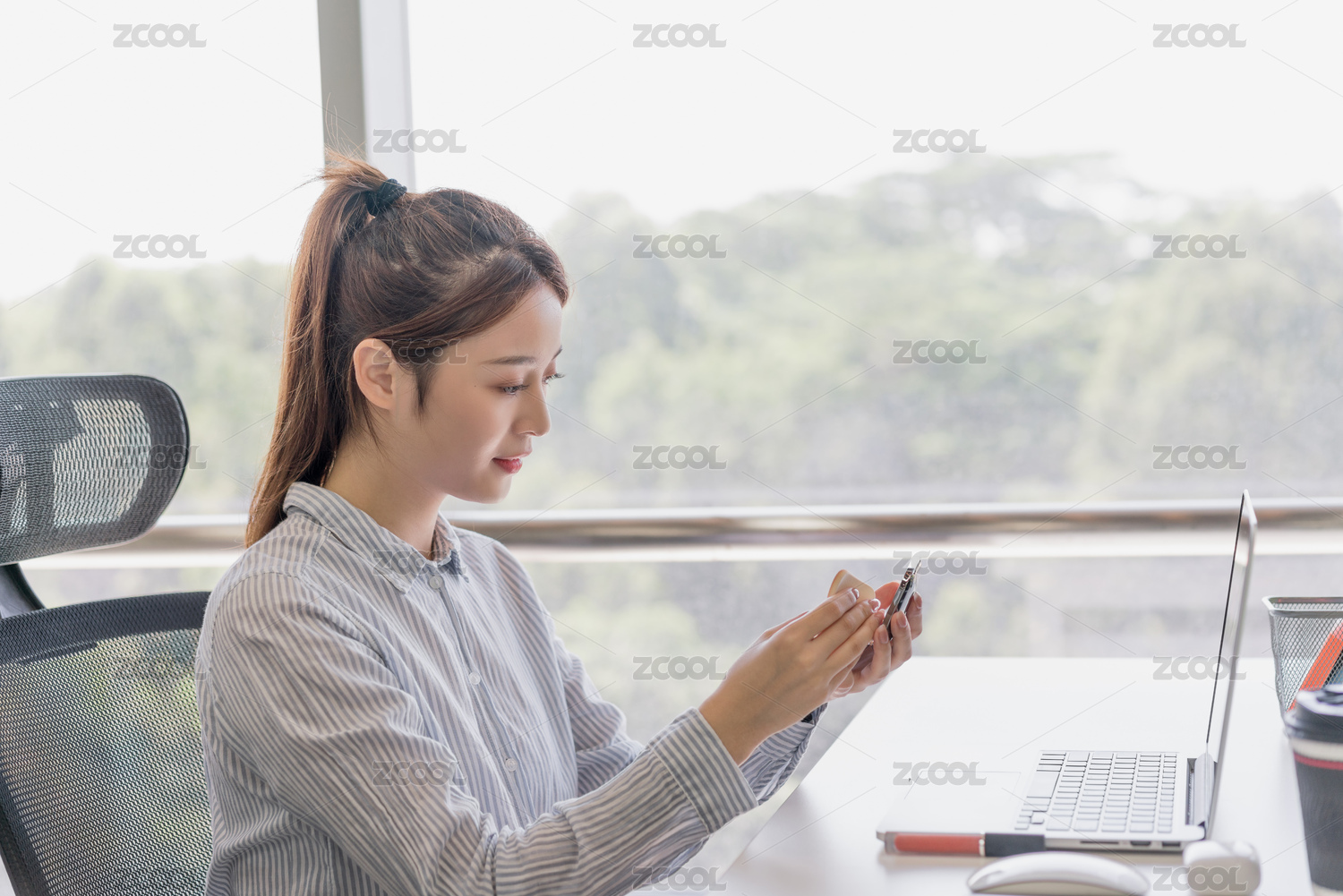 商務女性在辦公室工位上化妝