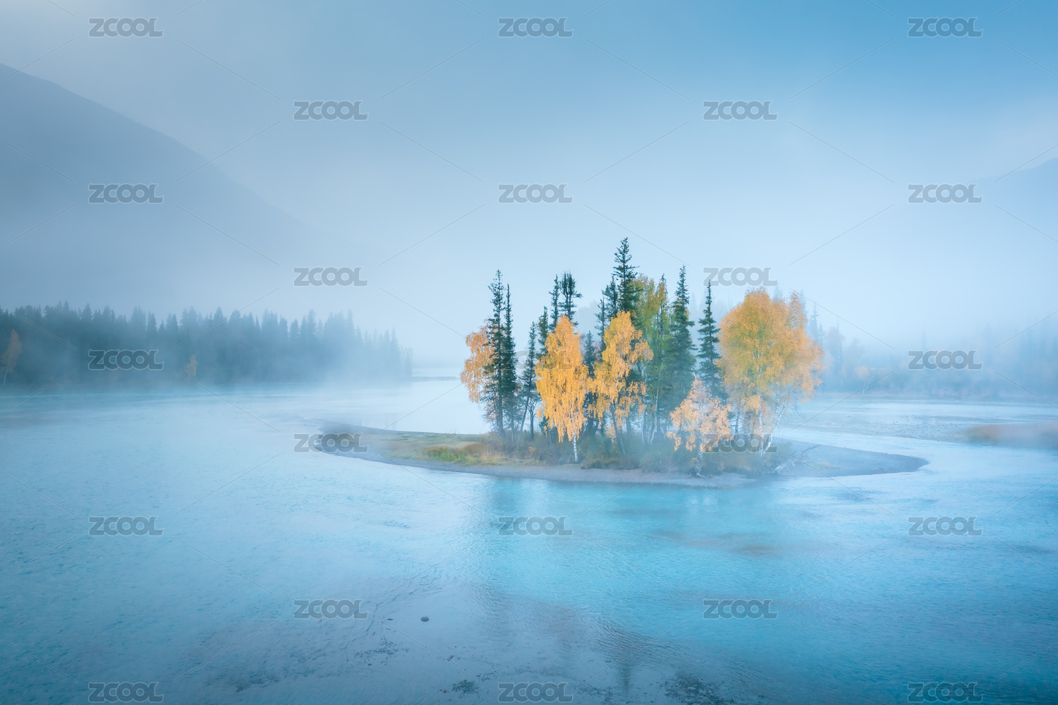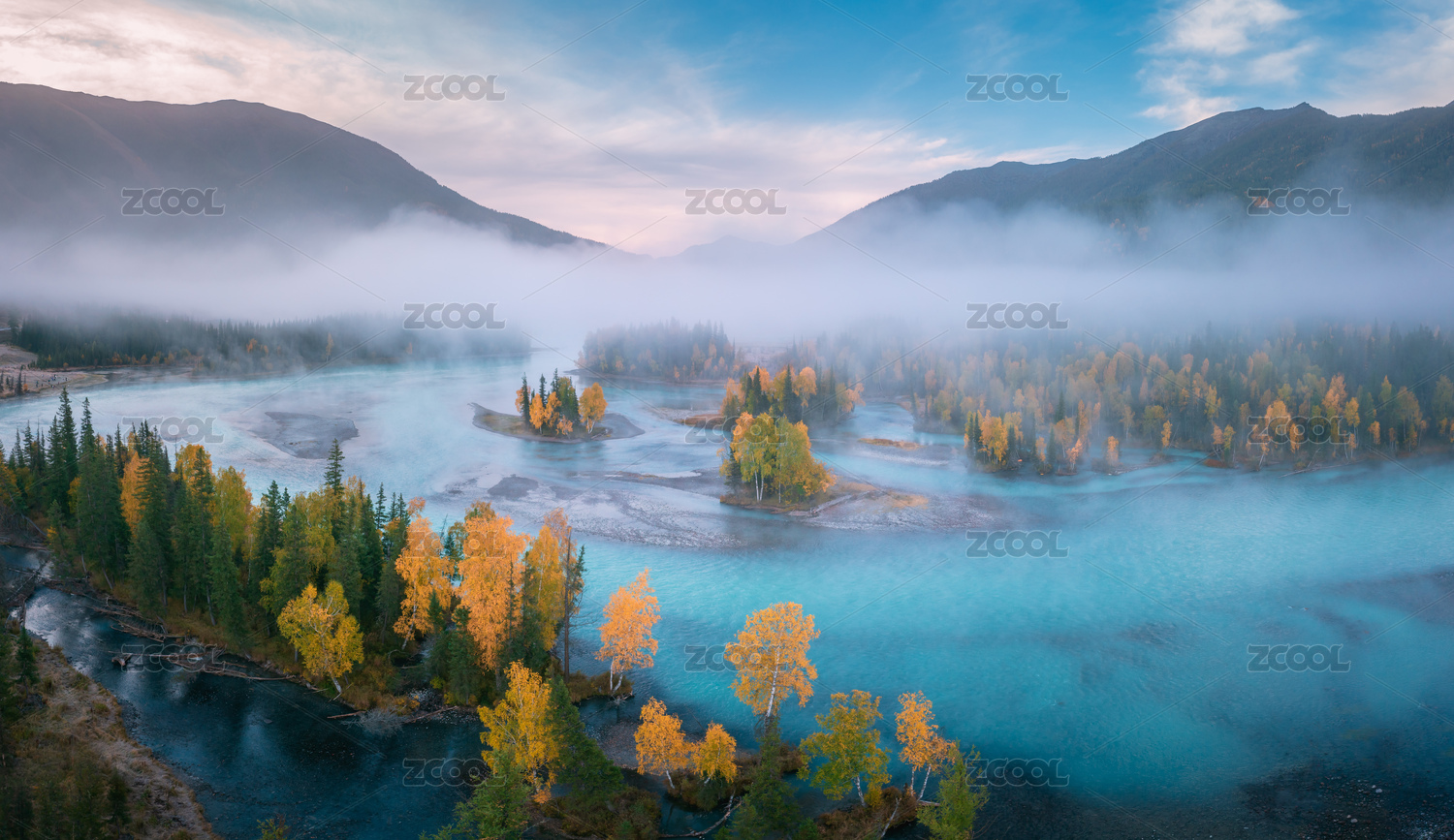 中國新疆阿勒泰喀納斯河清晨晨霧自然風(fēng)光