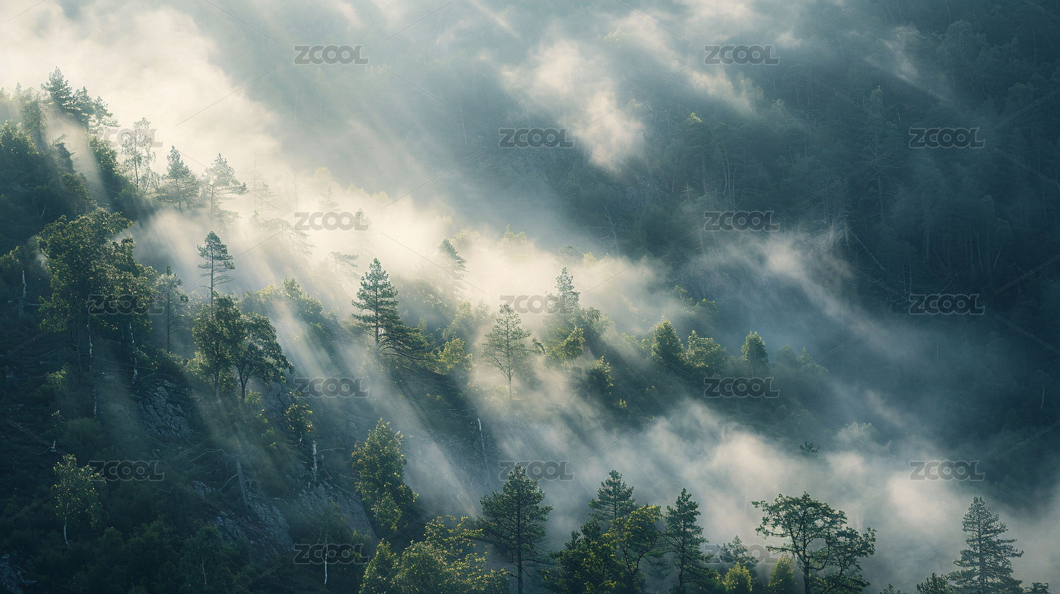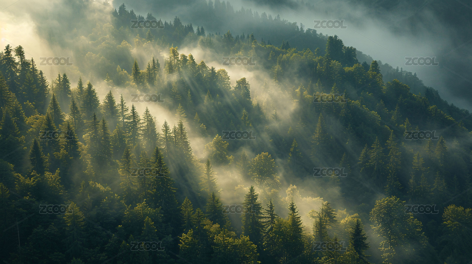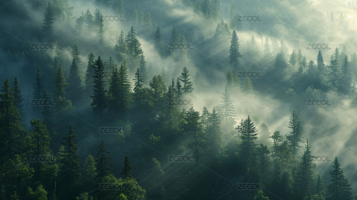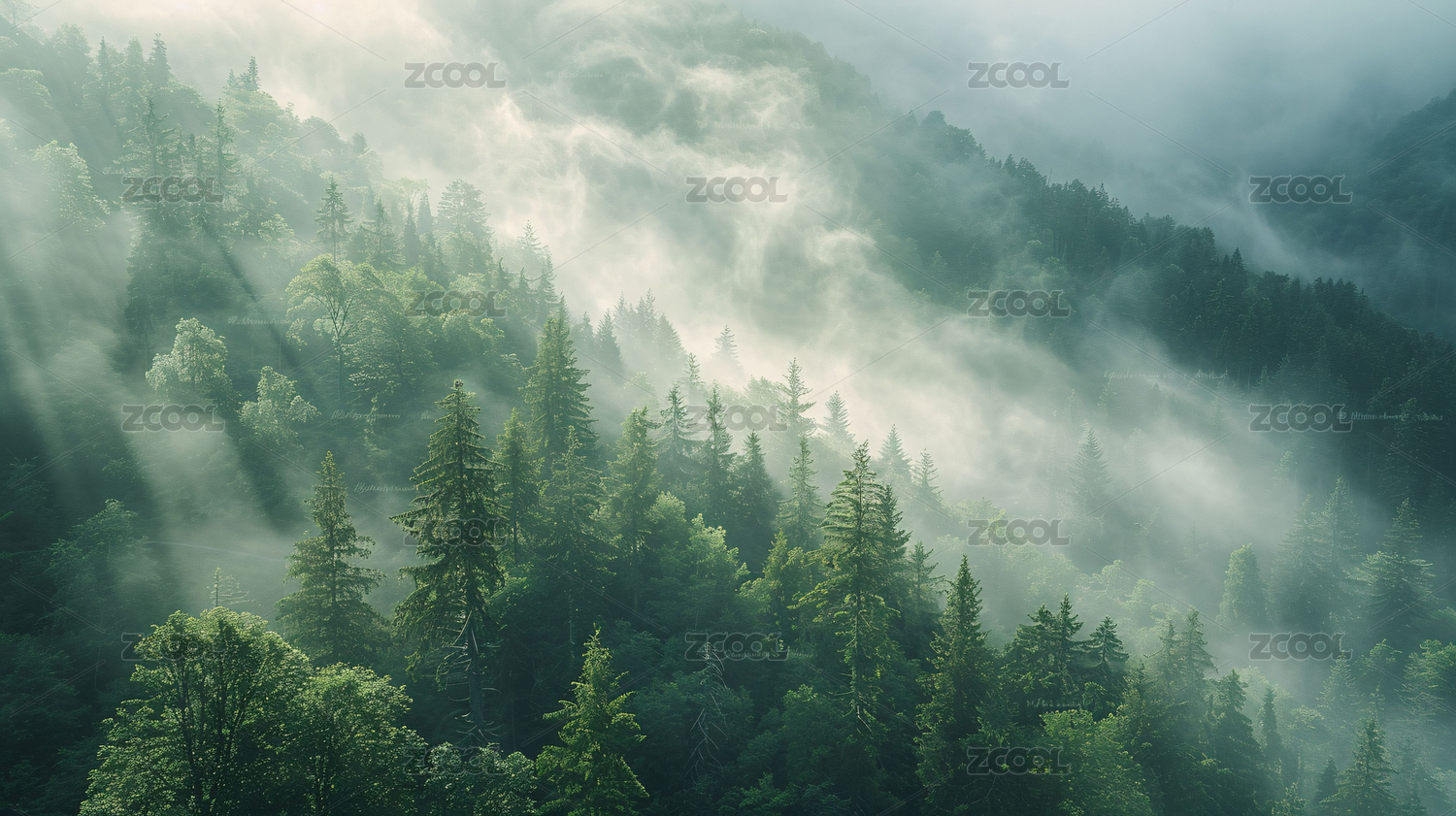 濃霧籠罩著綠色茂密的森林,令人驚嘆的早晨