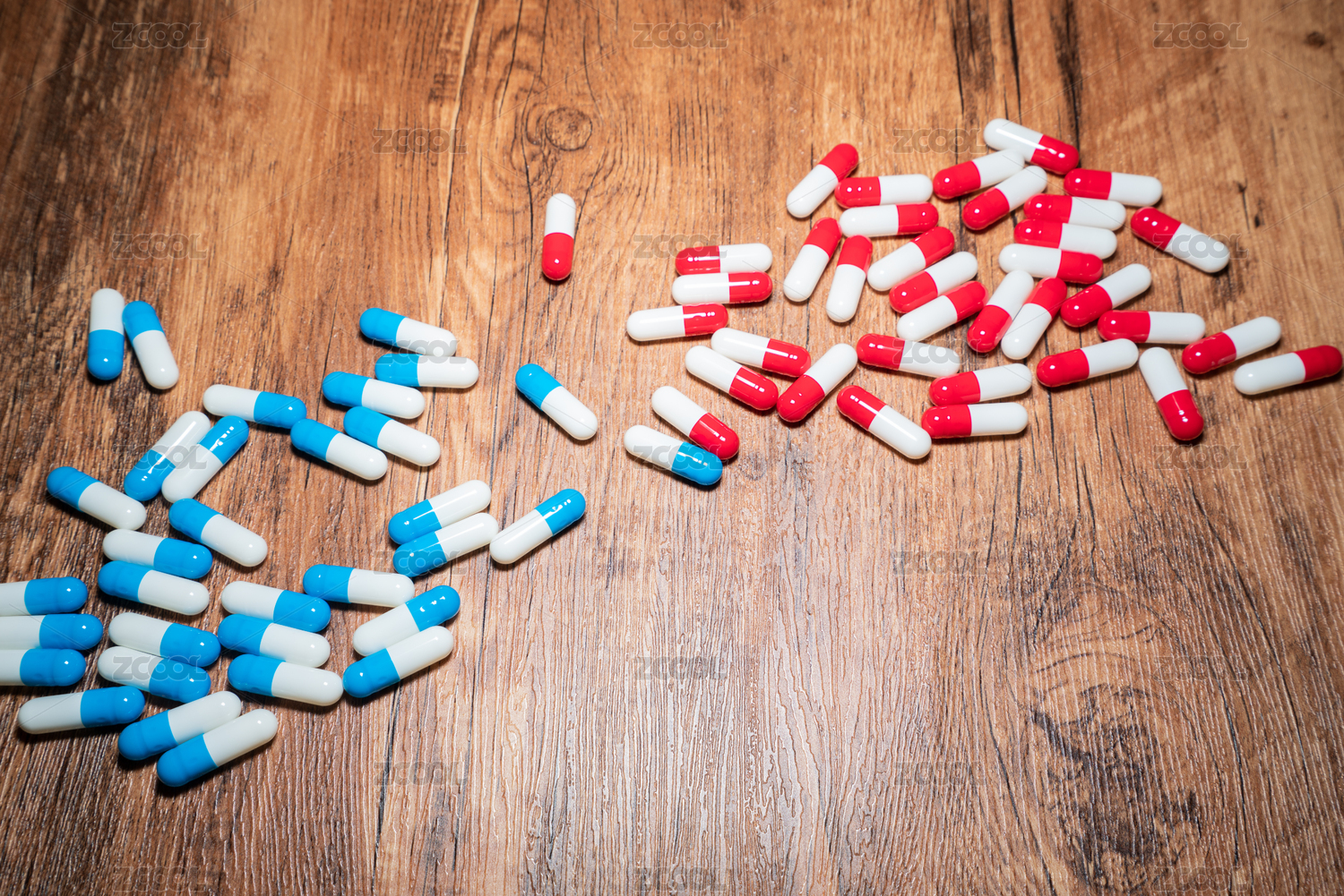 木制紋理桌面上放著藥囊膠囊藥瓶吃西藥治病概念