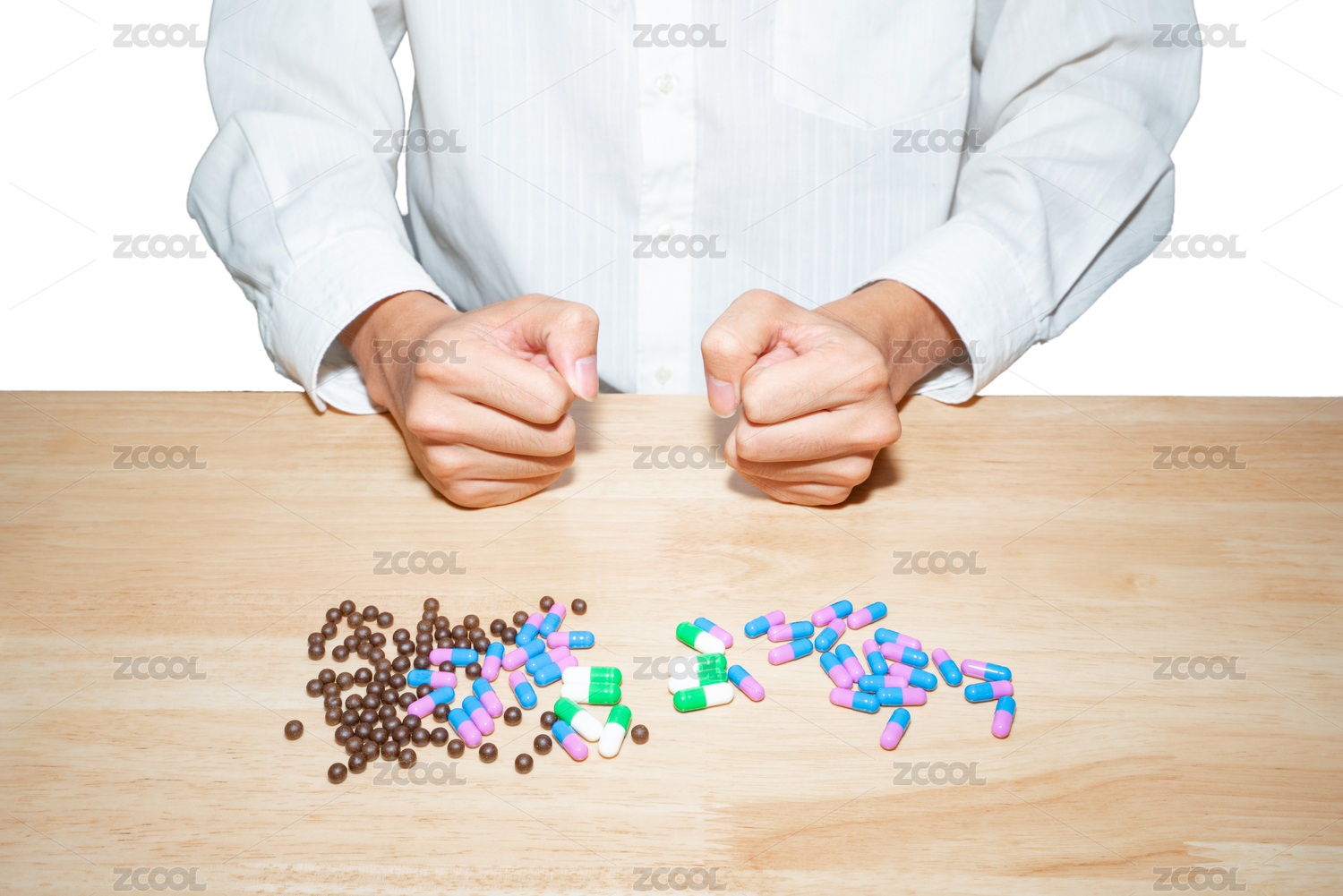 一個(gè)人坐著桌子旁看著滿桌子的中藥西藥藥丸藥囊藥片保健品很煩惱煩躁生病得病治病買藥藥價(jià)概念