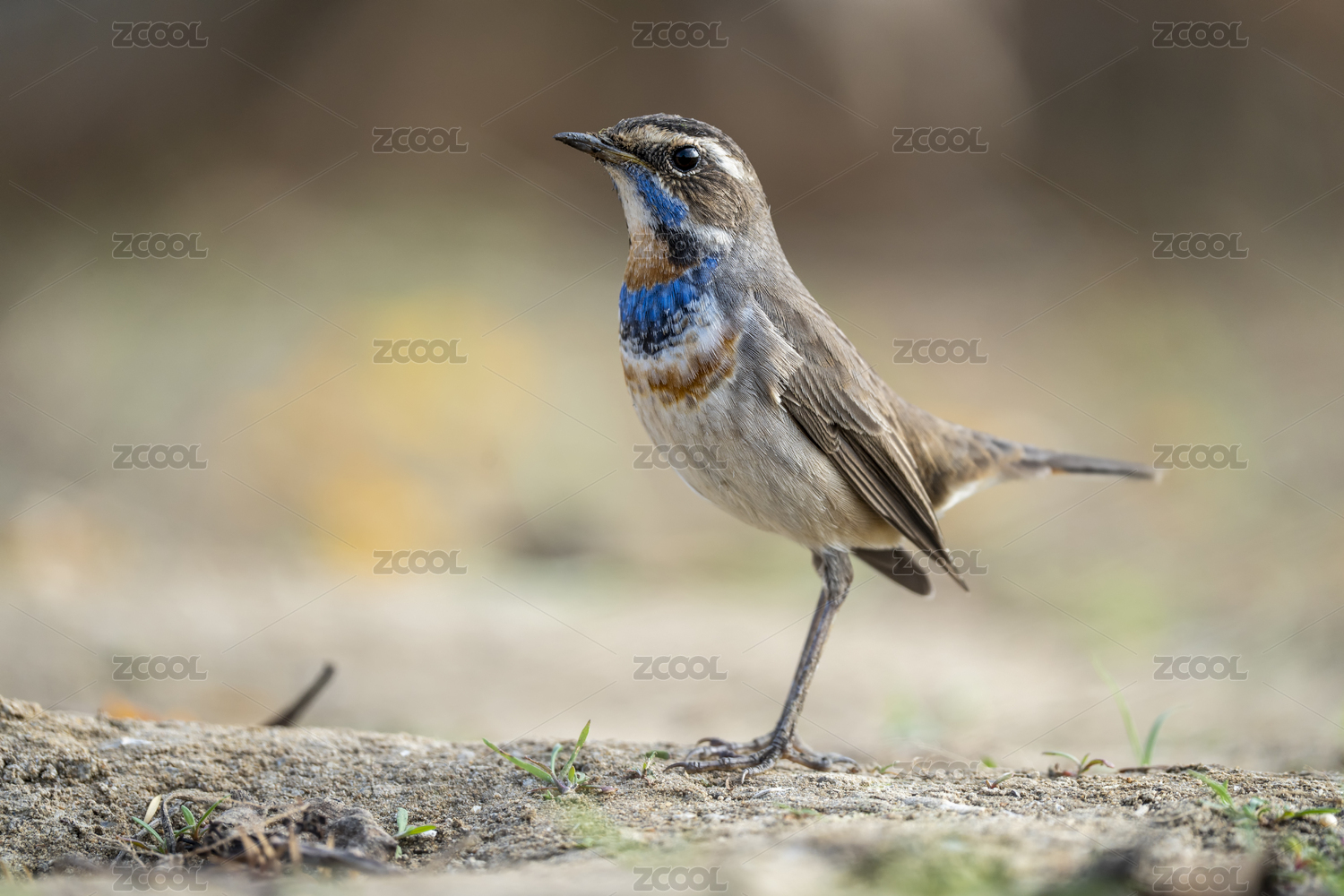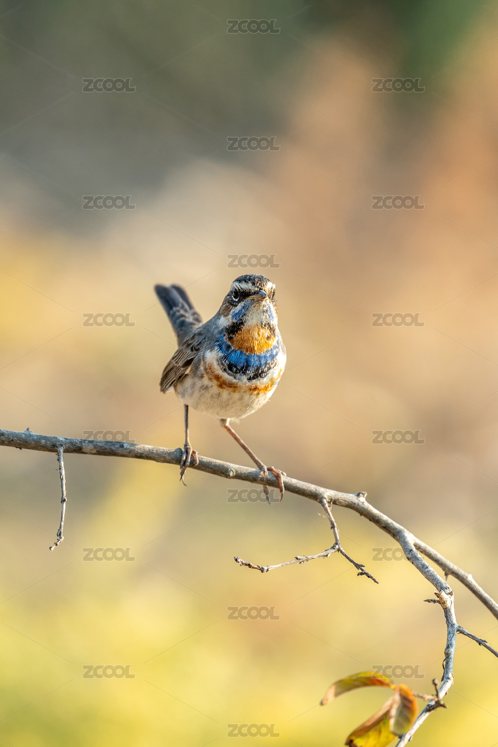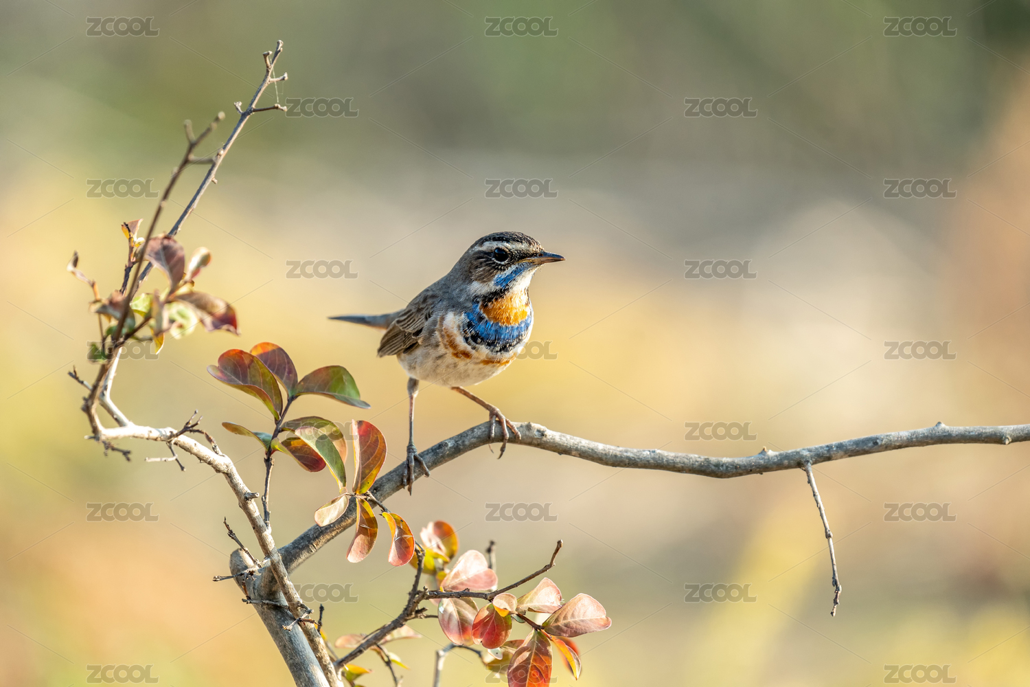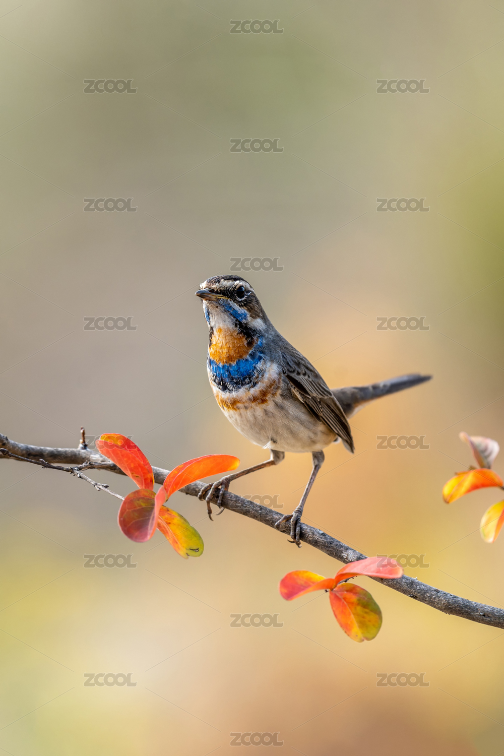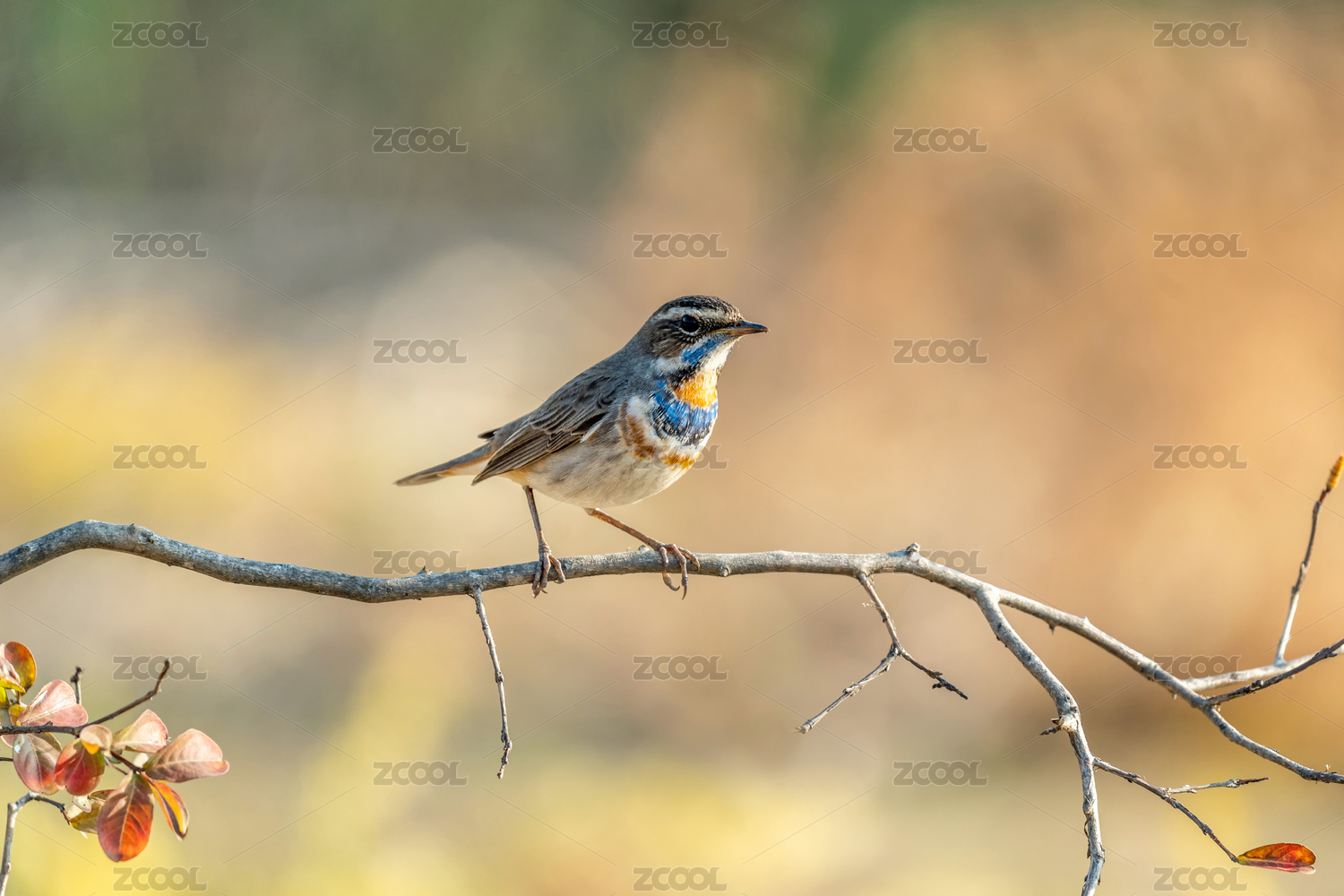 一只藍喉歌鴝鳥立于花枝上歌唱伺機覓食