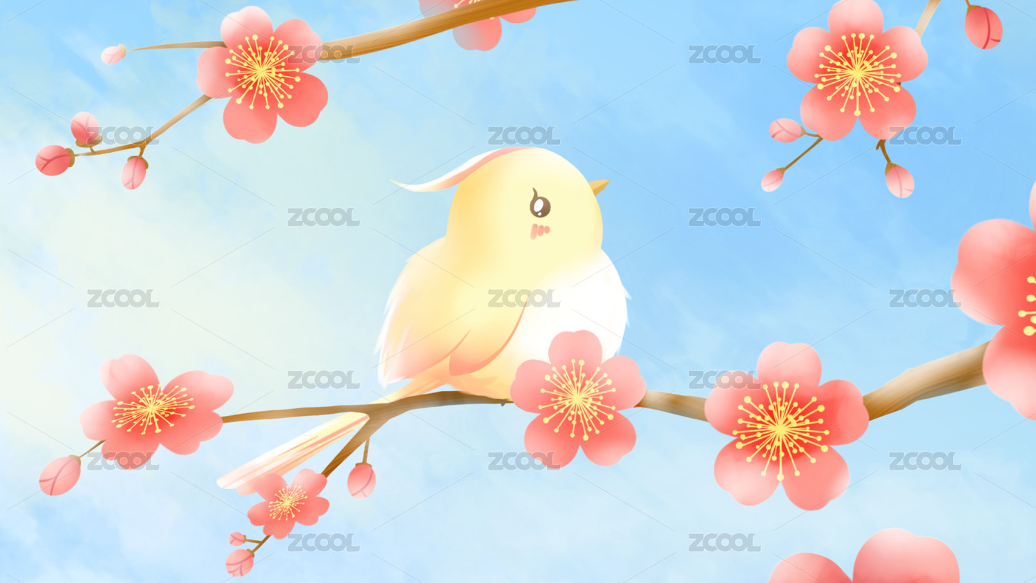 春天 桃花盛開 鵝黃色小鳥站在枝頭歌唱