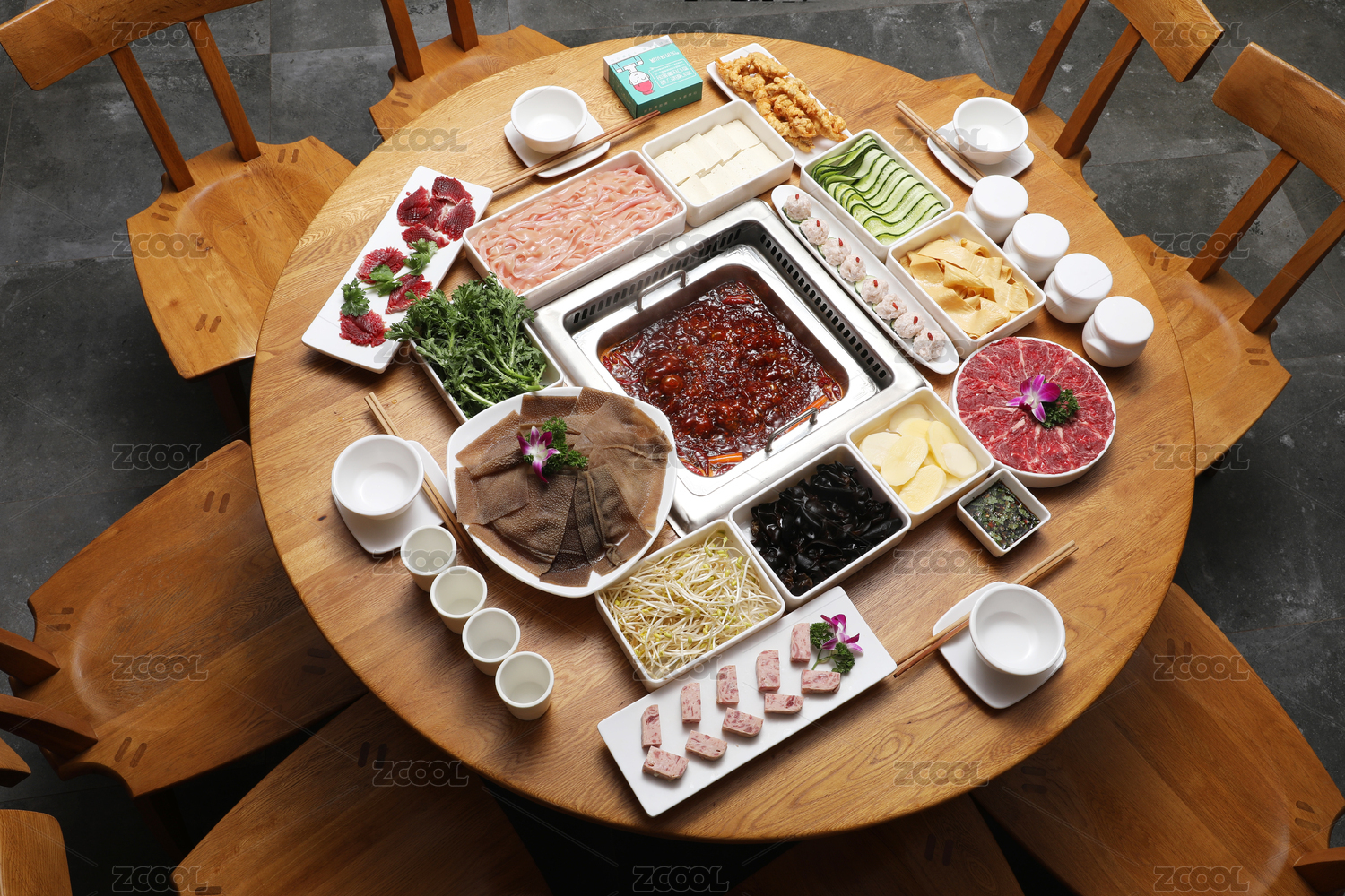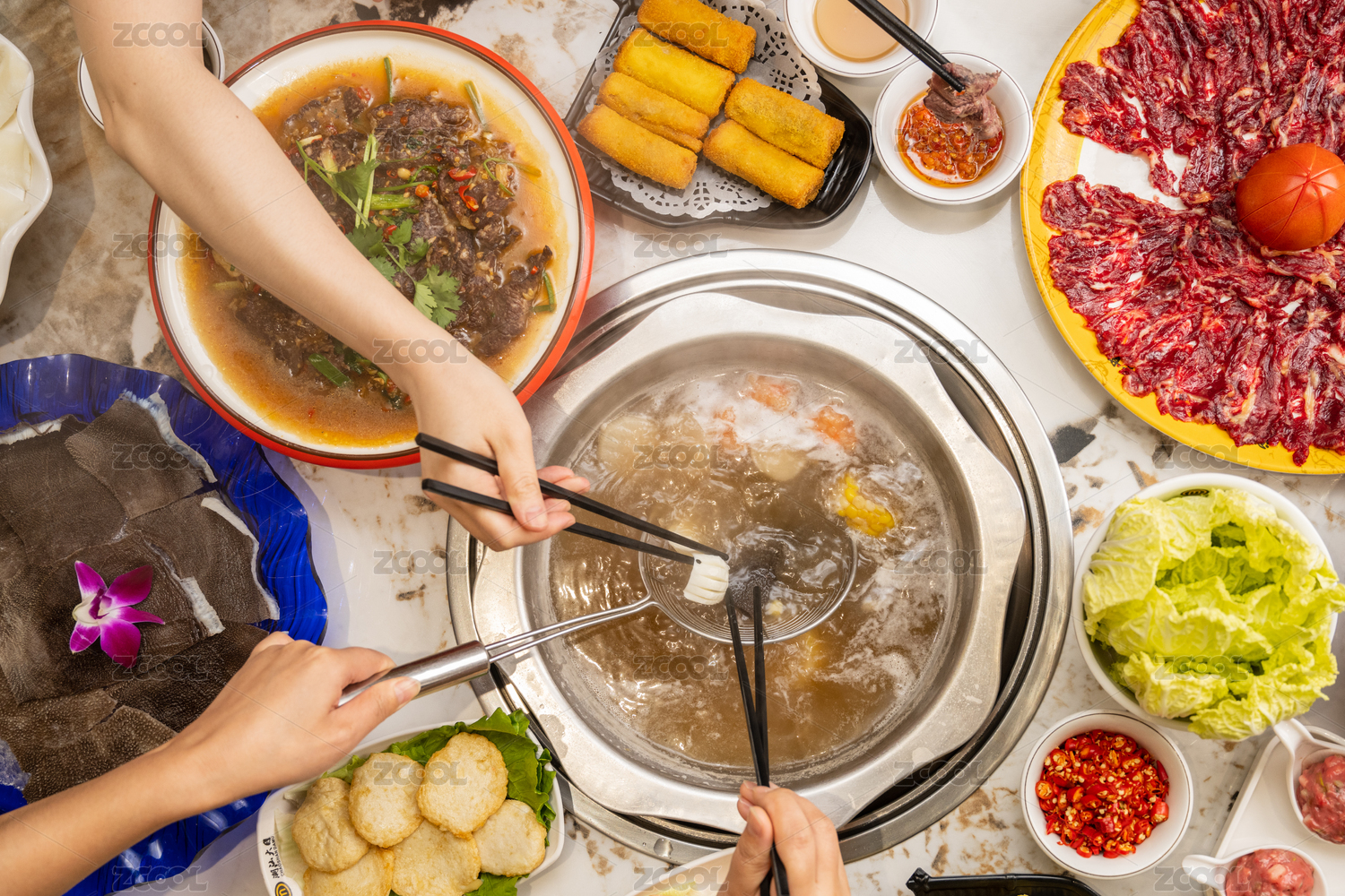 火鍋店一桌各種各樣的火鍋菜品