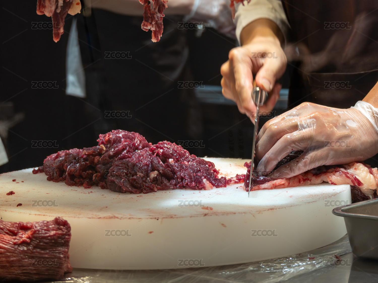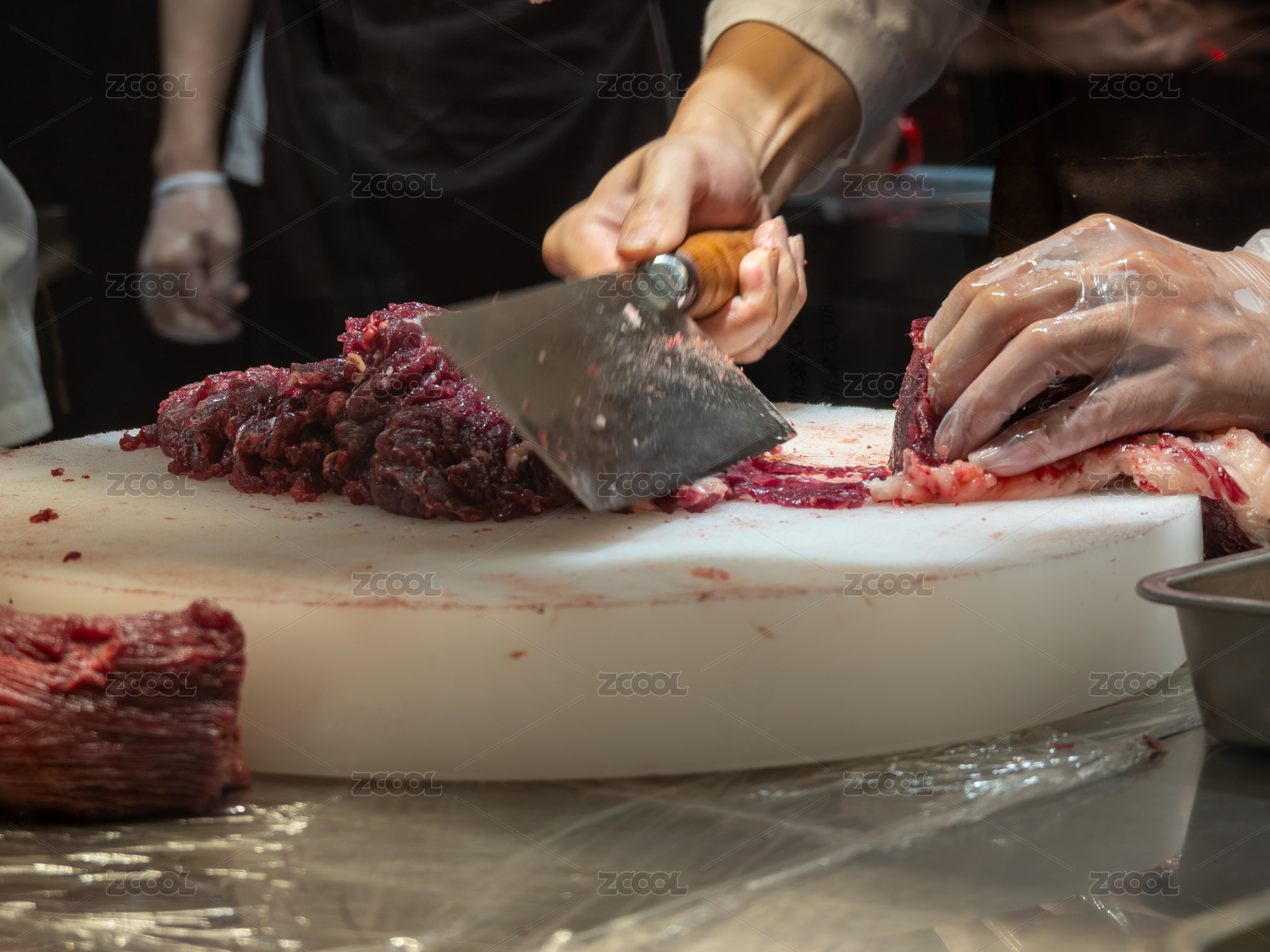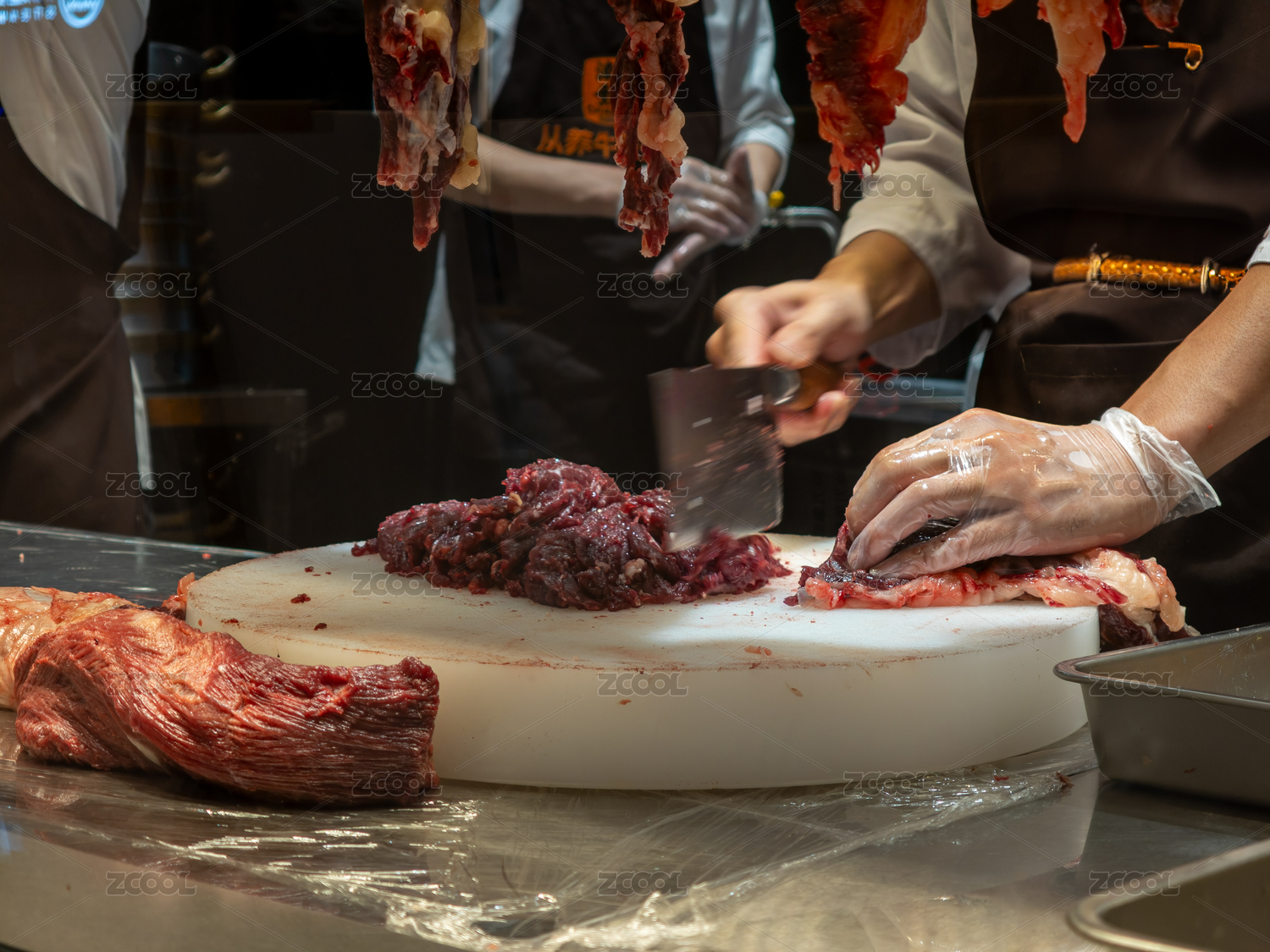 潮汕牛肉火鍋店的師傅正在手切新鮮牛肉