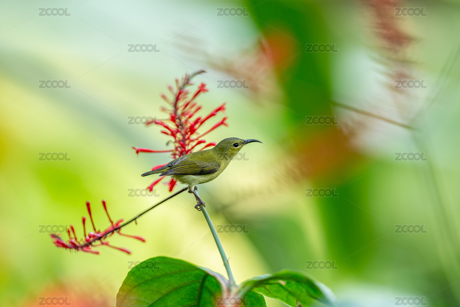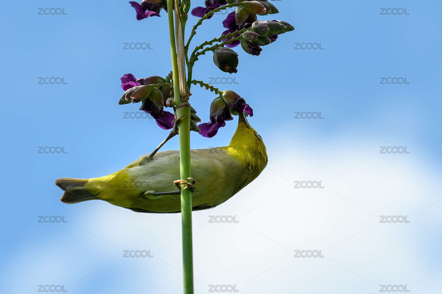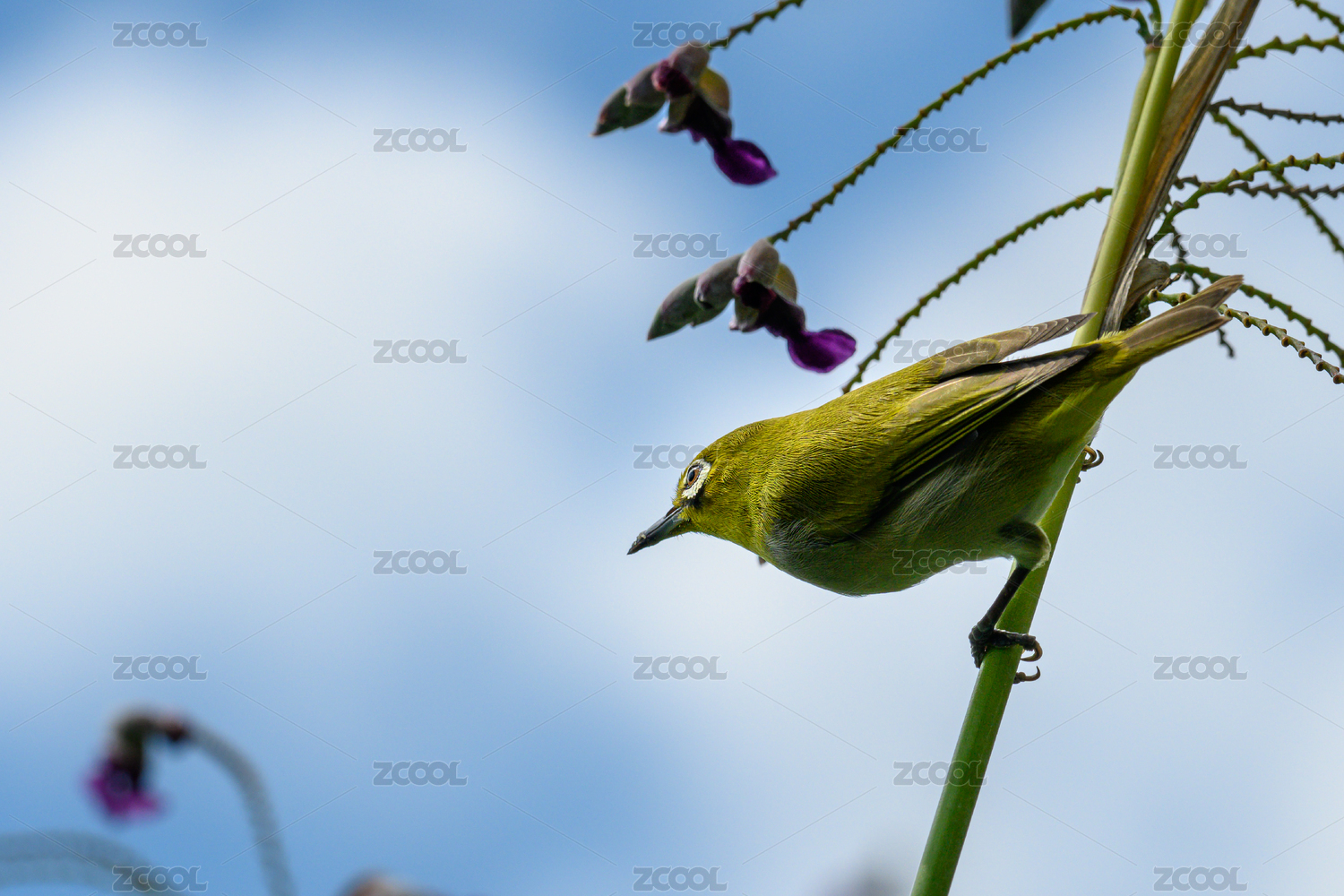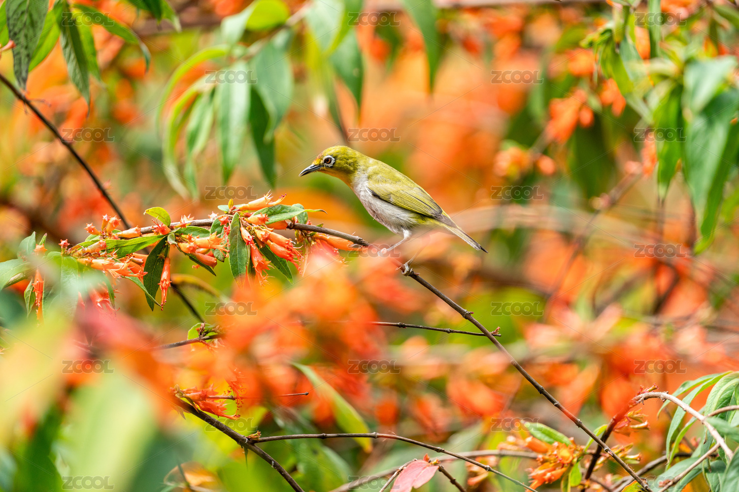 暗綠繡眼鳥在蝦米花上吮食花蜜