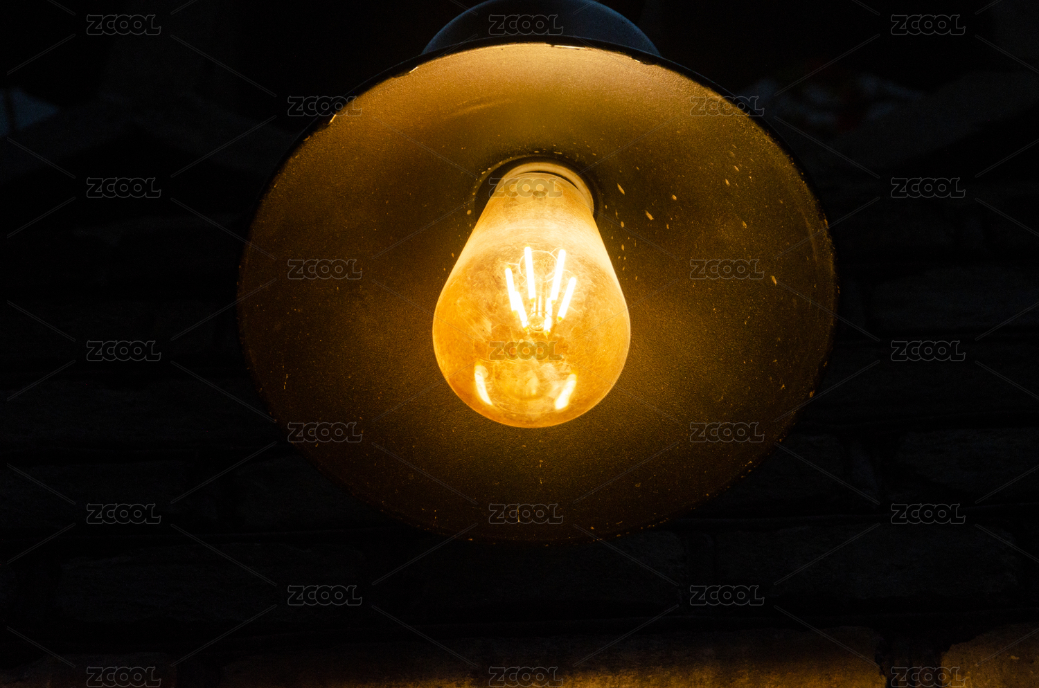 昏暗的紅磚瓦房間中一盞白熾燈特寫