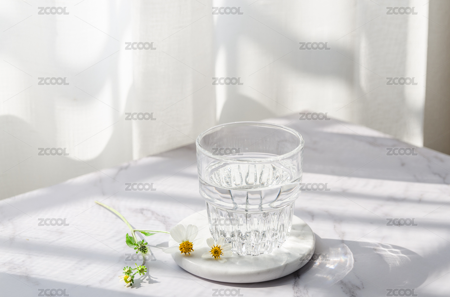 一杯裝著純凈水的透明杯子,放在桌子上,純色的背景