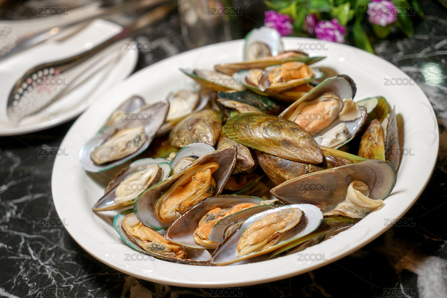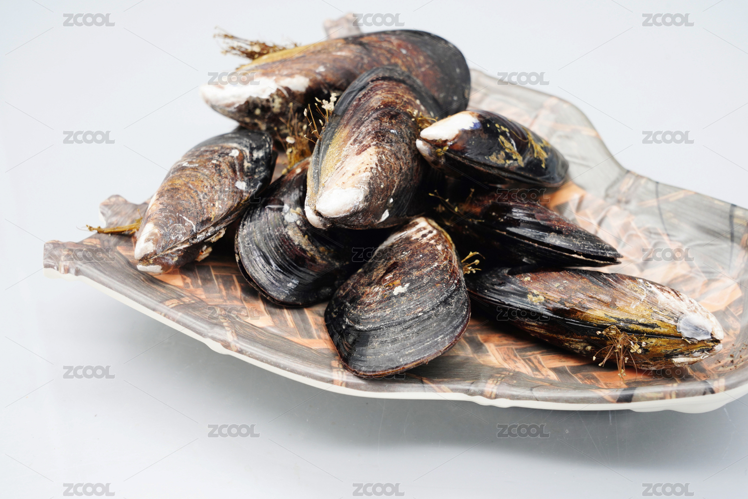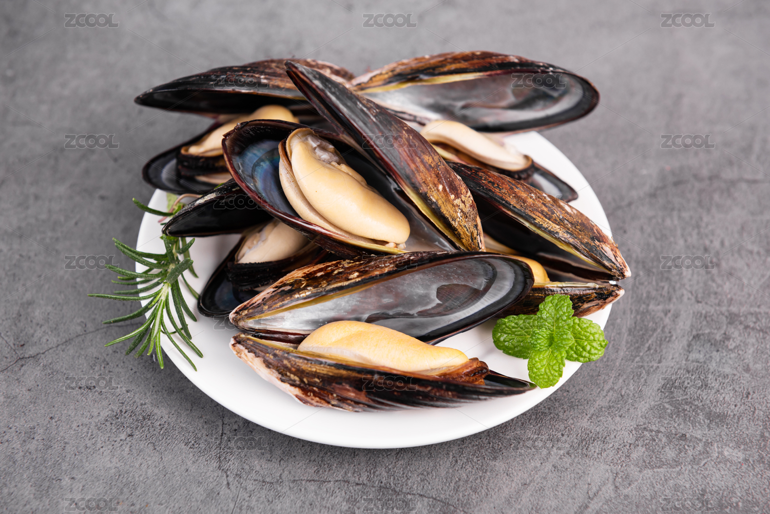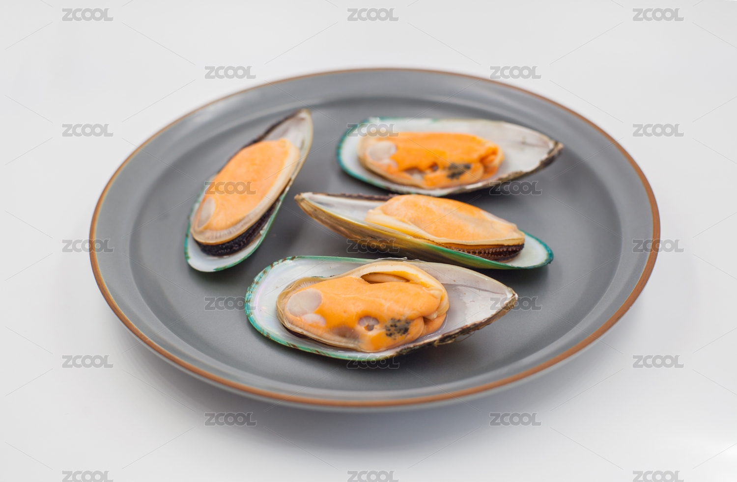 裝在盤子里的餐飲食材海鮮貽貝