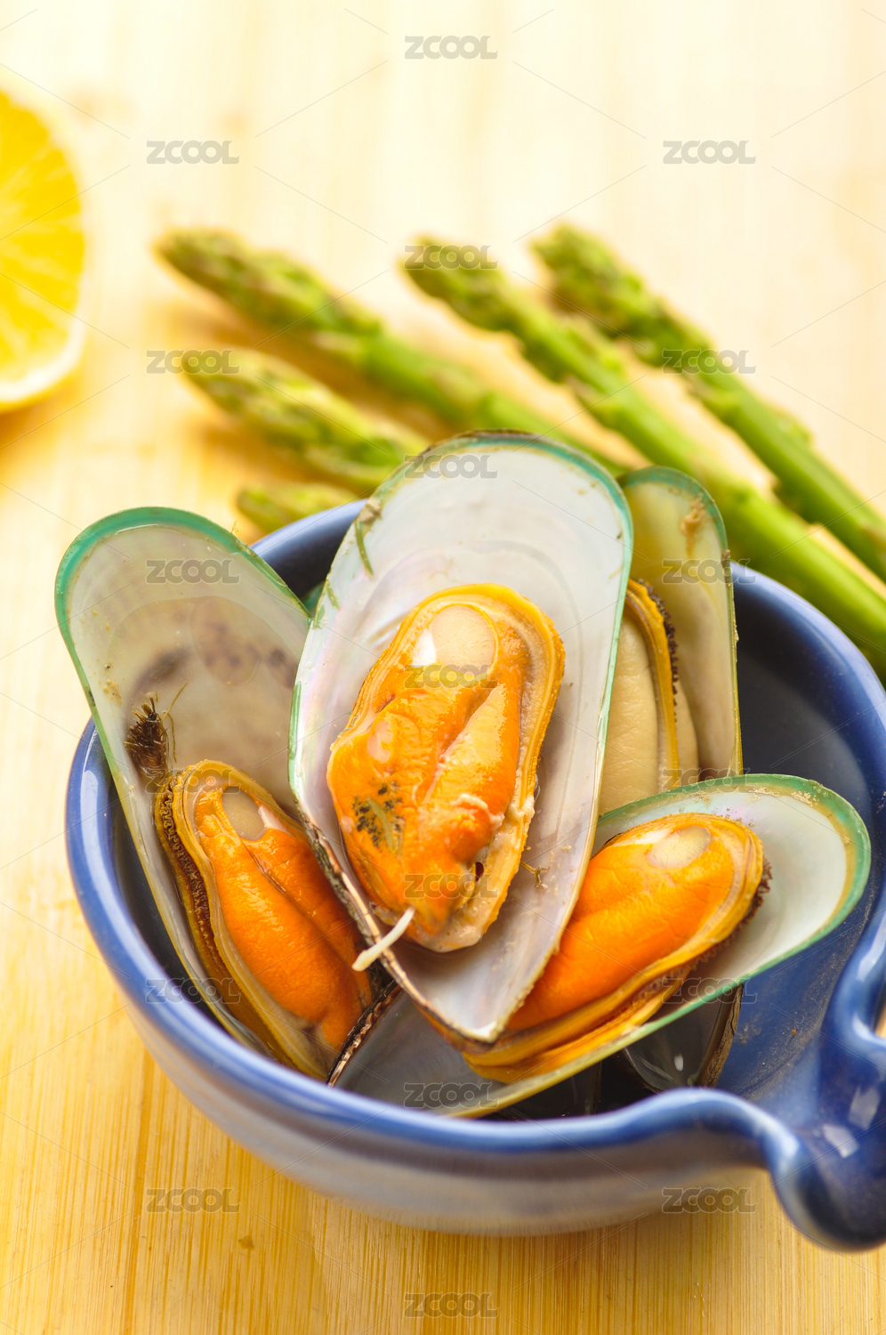 木桌面上藍(lán)色小碗里的青口貝海虹貽貝