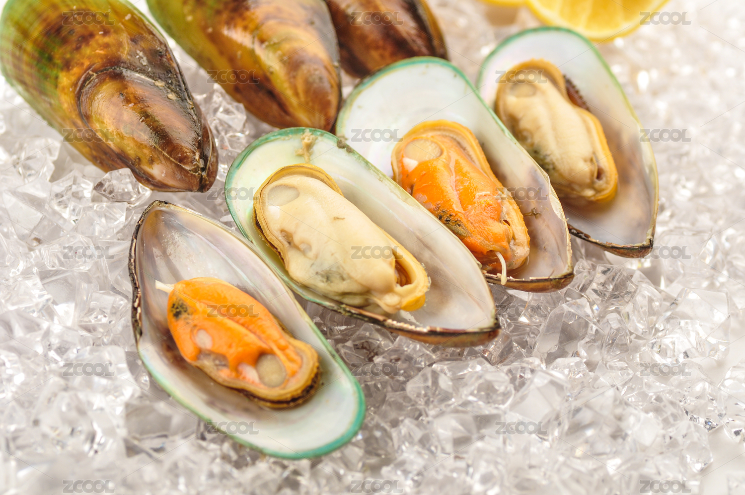 淺色背景冰塊上的海鮮青口貝貽貝海虹