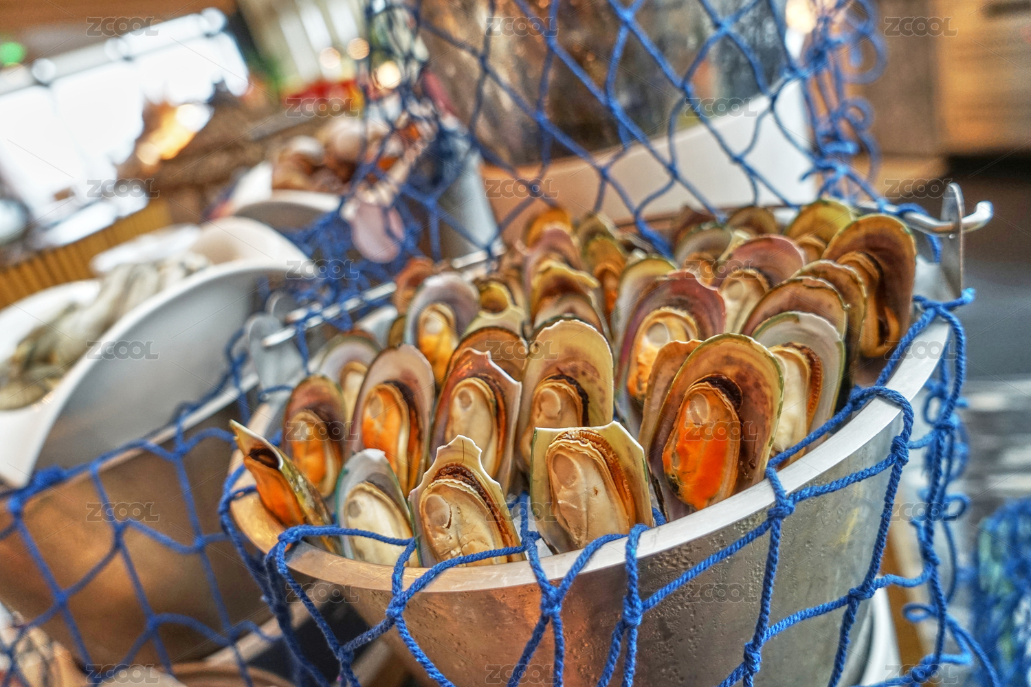 自助餐廳里盛放在保鮮鐵桶內(nèi)的貽貝