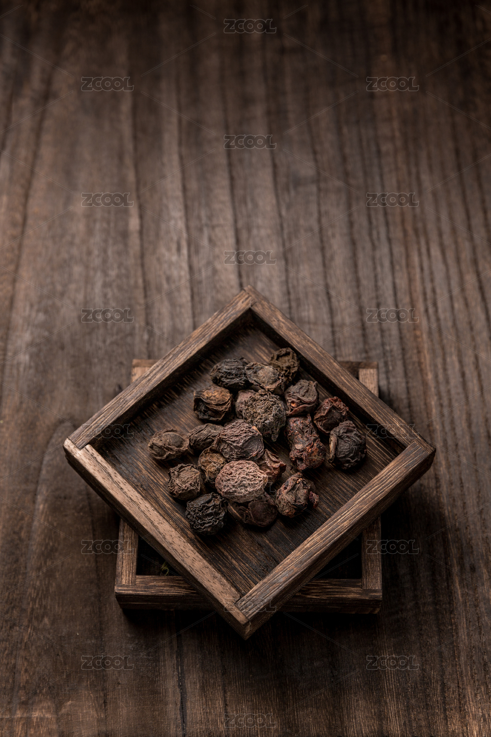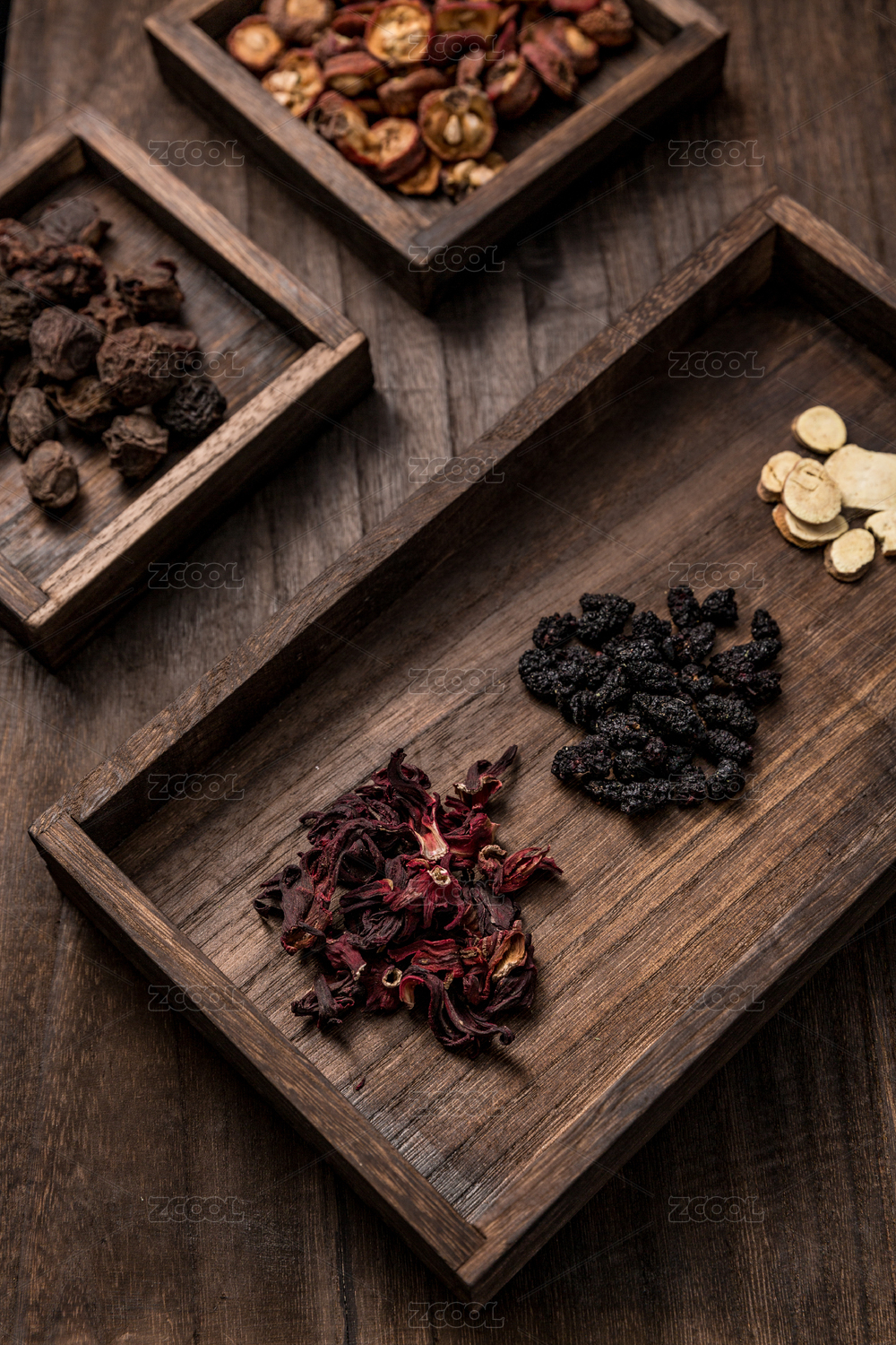 麻布背景木盒子里的酸梅湯原材料