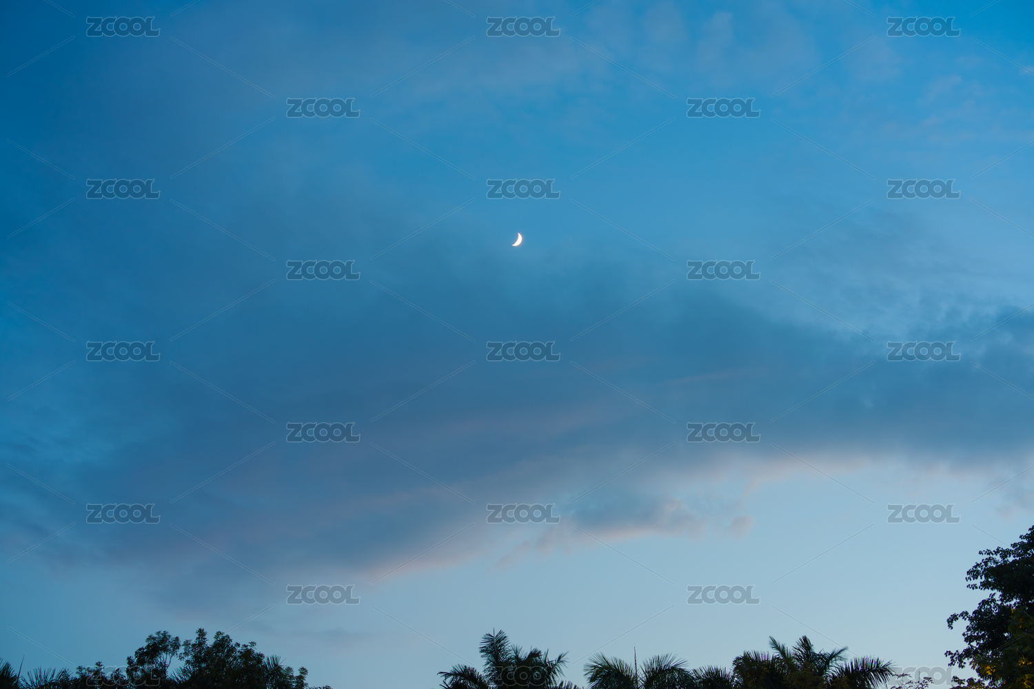 藍(lán)天下樹林上空的月牙