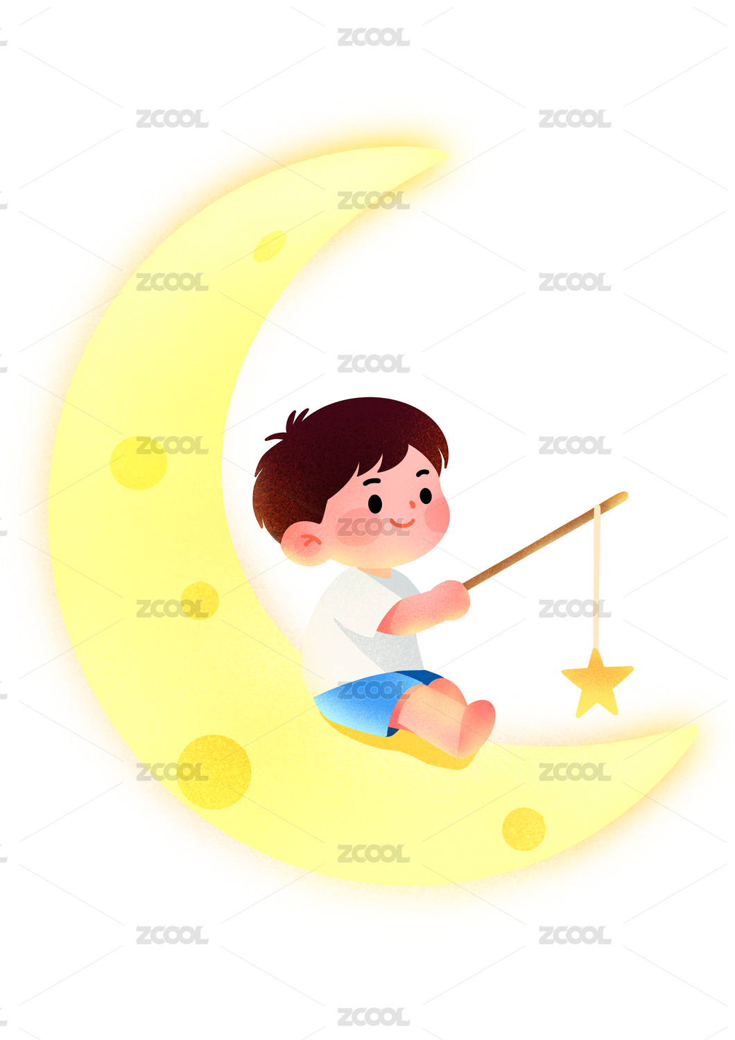 小男孩在月牙上釣星星