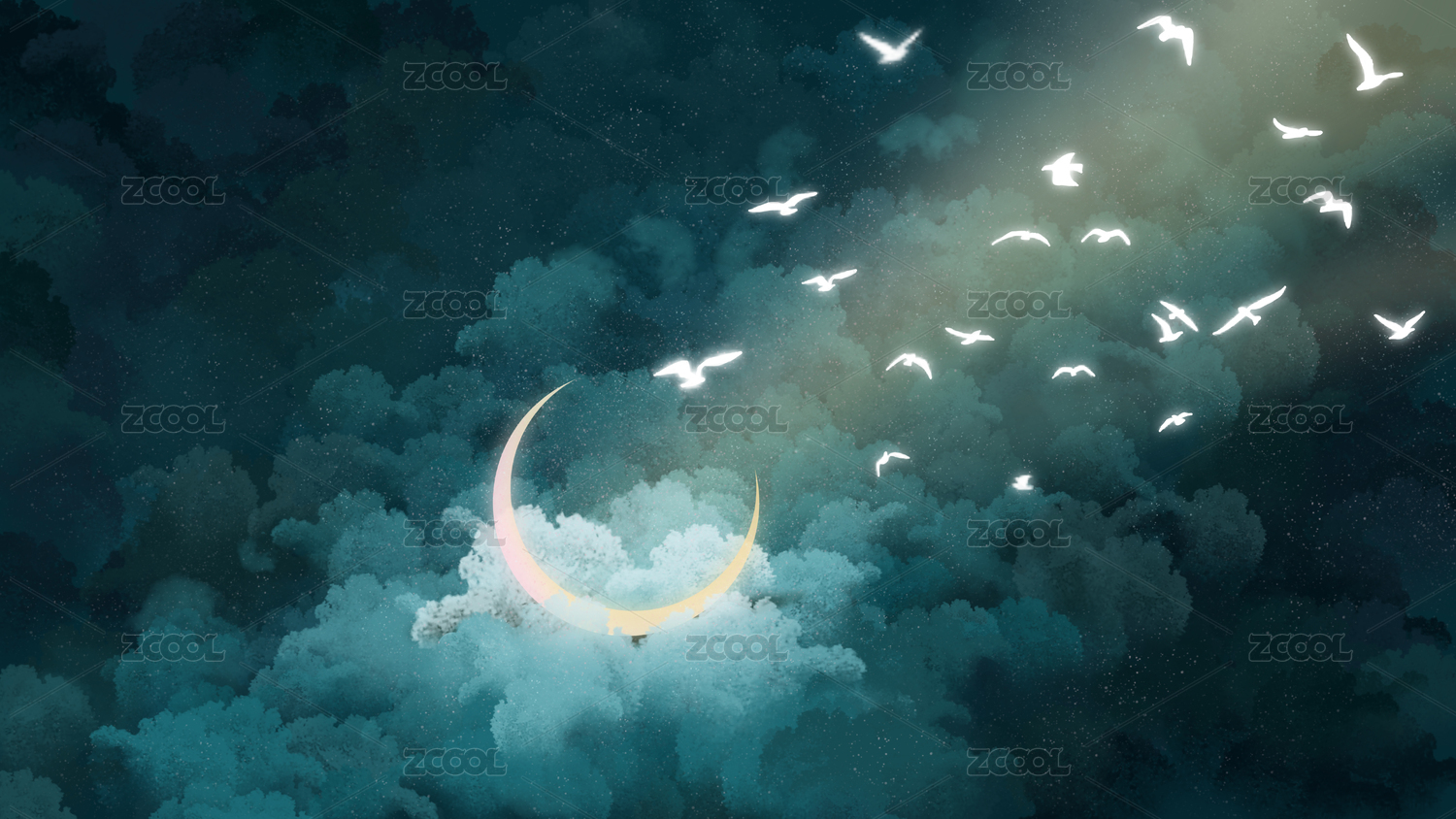 深綠色厚積云背景下的月牙與飛鳥橫構(gòu)圖插畫