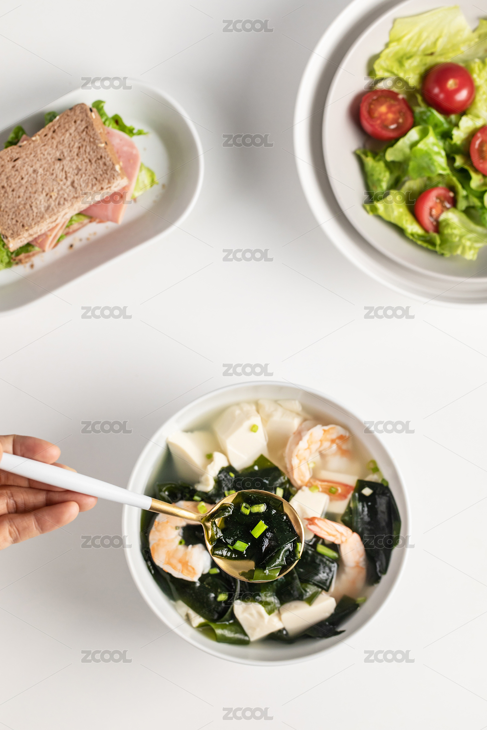 白背景一碗裙帶菜豆腐湯