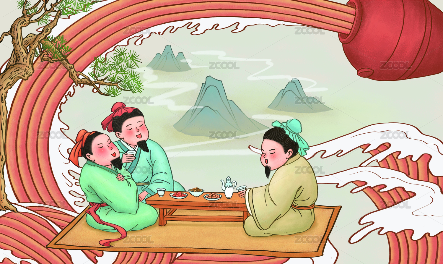 山水背景下的朋友聚會(huì)圖