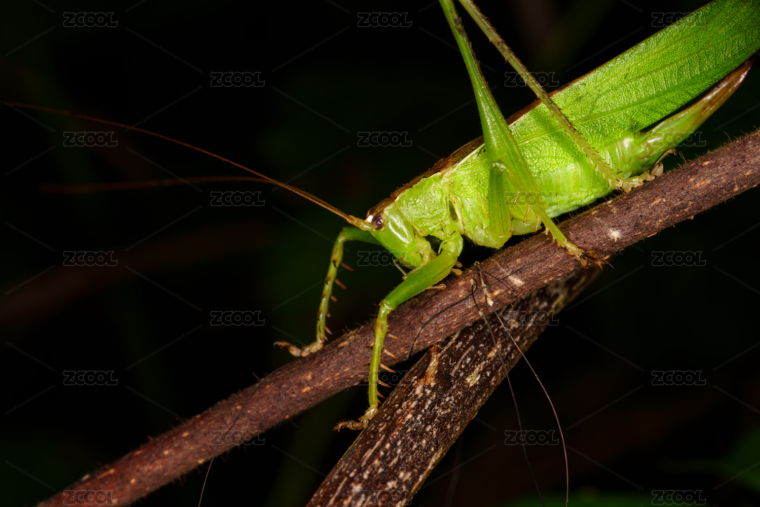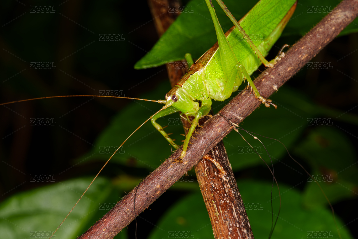 翠綠螽斯停駐于樹枝的特寫畫面